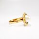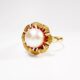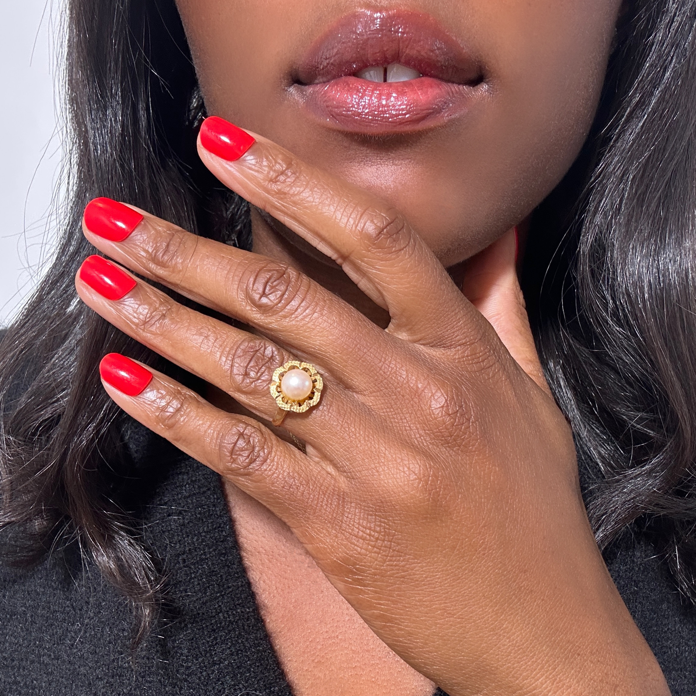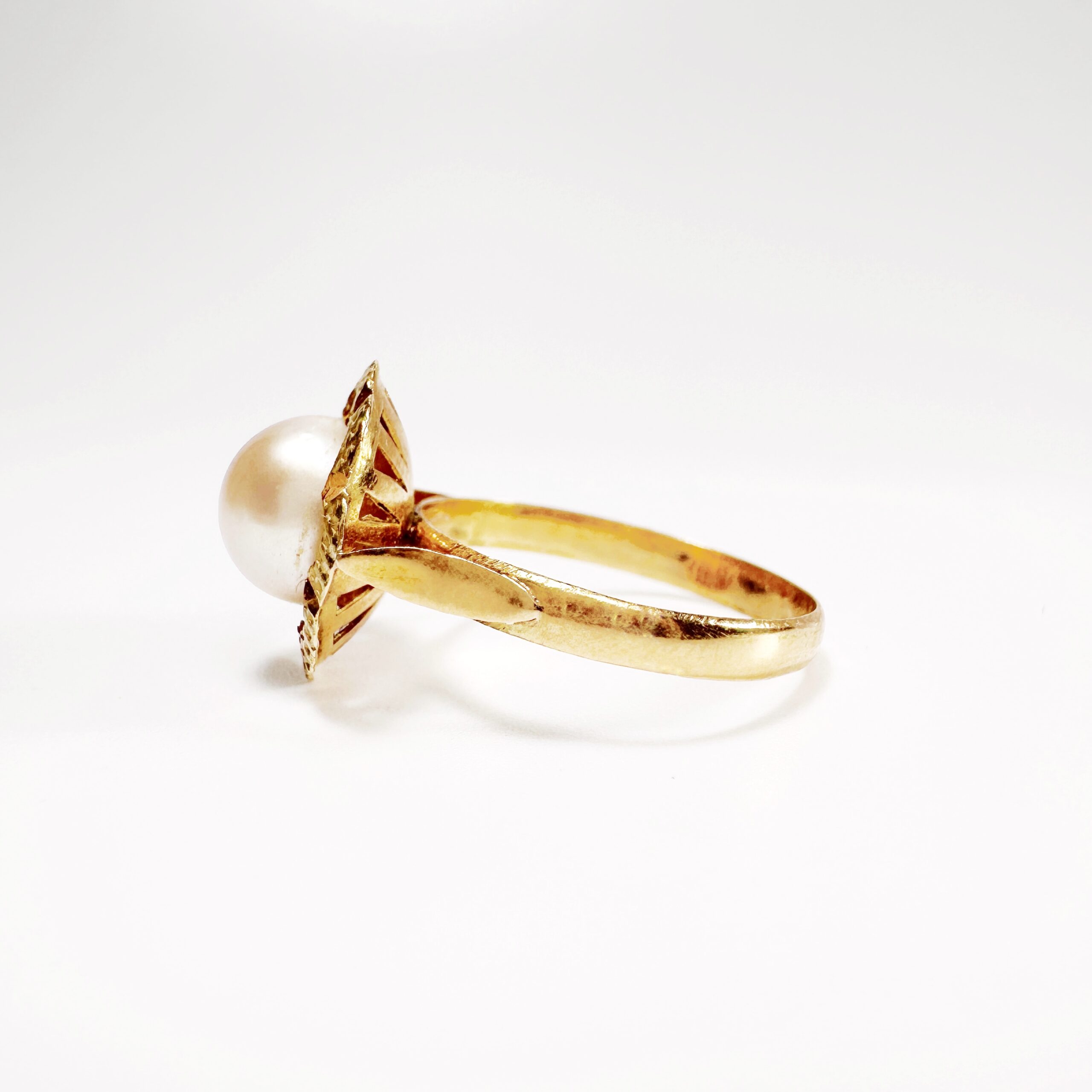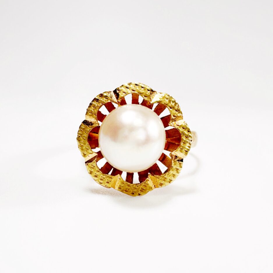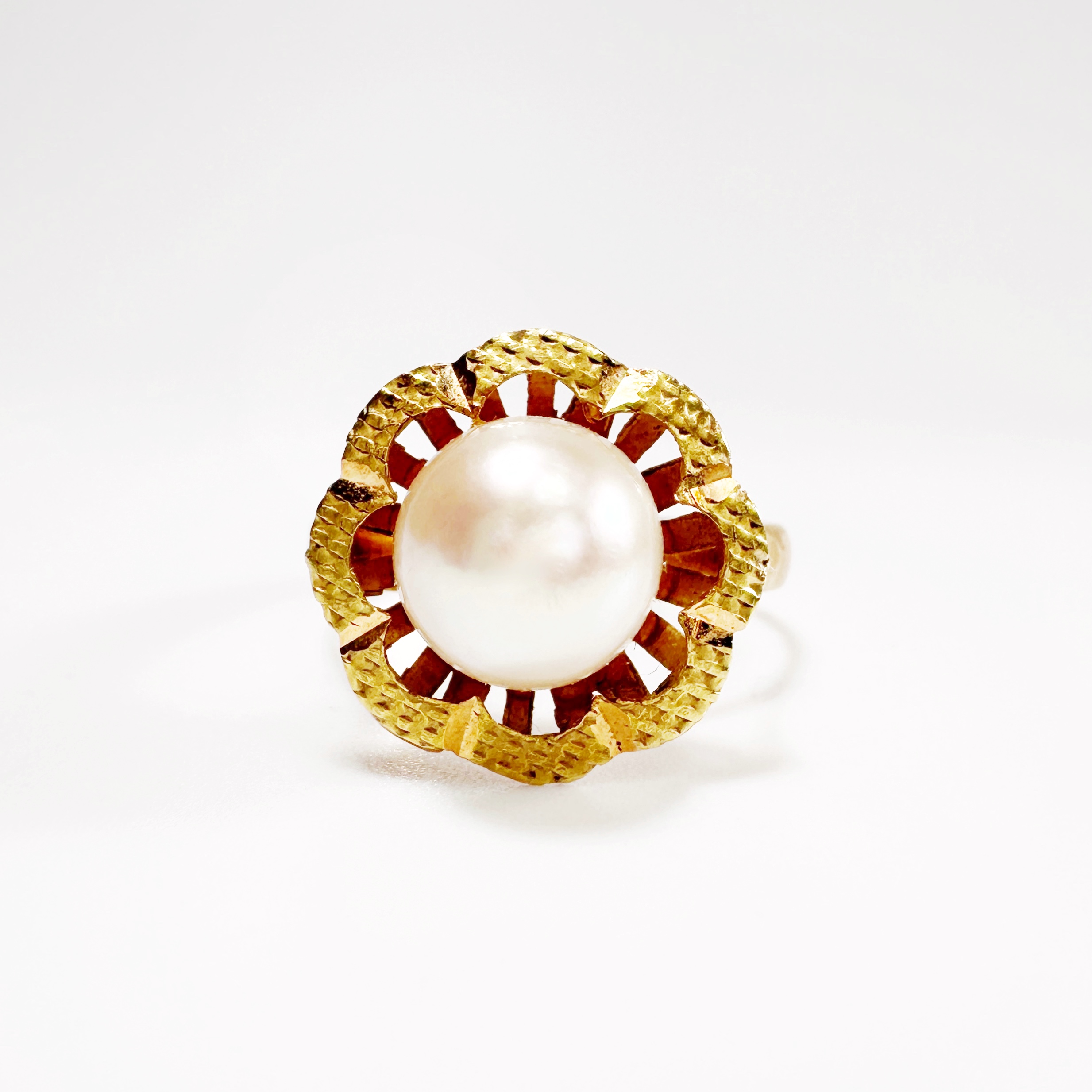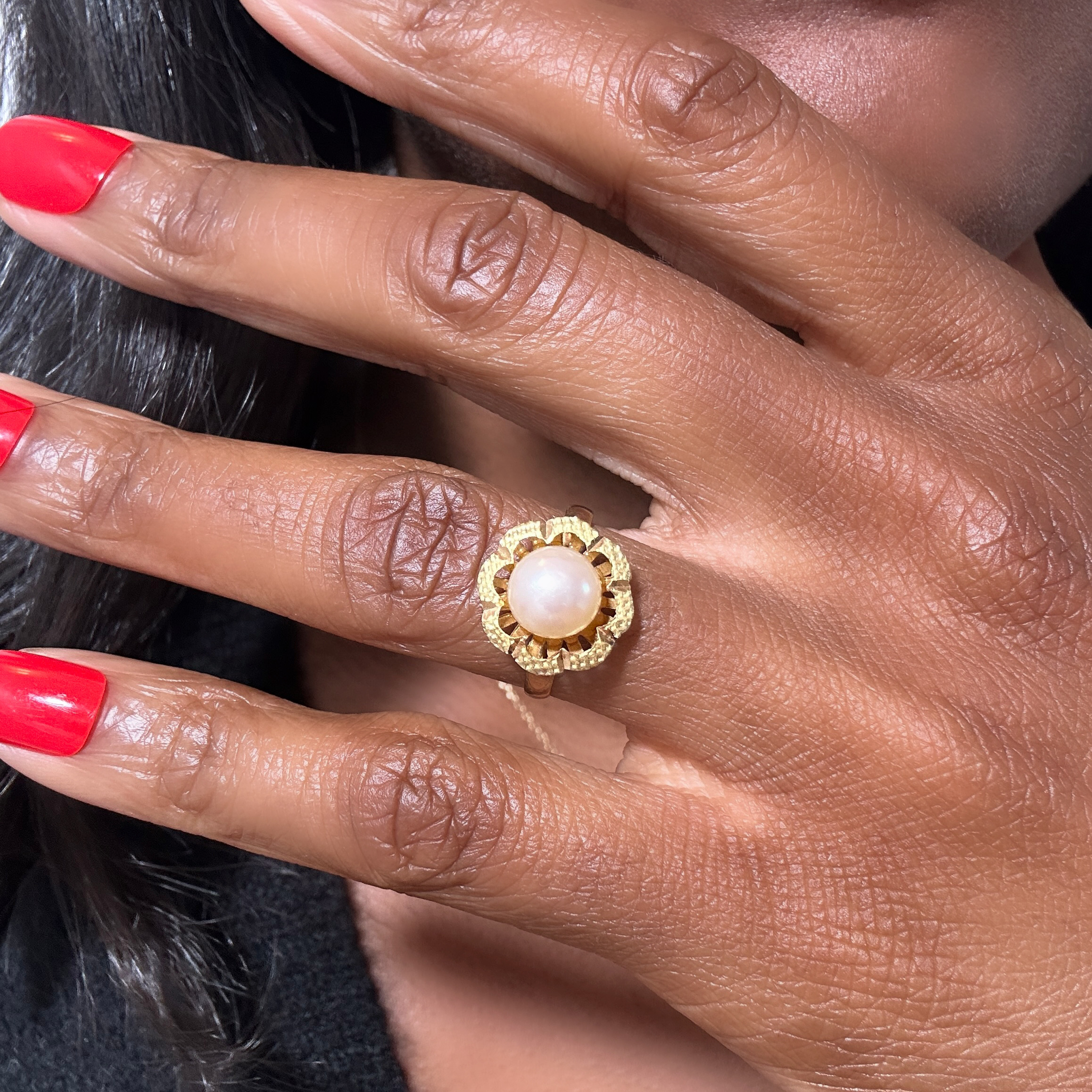 Sublime bague des années 50 en or 18 carats présentant une perle de culture s’épanouissant au centre d’un chaton en corolle. Les pétales facettée de la fleur captent la lumière à chaque mouvement pour effet des plus saisissants. Une pièce féminine au travail délicat à porter au quotidien.