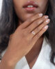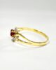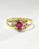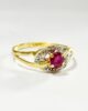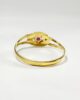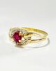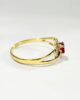 Sublime bague des années 60 or 18 carats sertie d’un sublime rubis rouge ardent de taille brillant de 0,25 carat en serti griffe et cerclé d’un halo en or blanc taille avec un fini diamant. Ce motif est centré sur un anneau en or jaune à deux branches, lui apportant légèreté et éclat. Une pièce élégante et colorée, où le rouge vibrant rubis contraste avec l’or jaune et blanc.