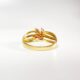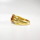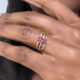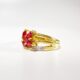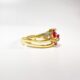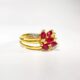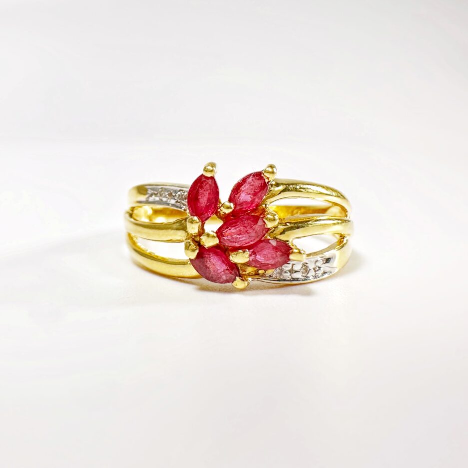 Sublime bague des années 60 en or 18 carats centrée d’un bouquet de 4 rubis rouge grenadine taille navette de 0,2 carat chacun en serti griffe sur un anneau en or jaune. Formé de 3 branches de part et d’autres du motif central, dont une en or blanc à fini diamant sertie d’un petit diamant brillant, l’anneau se réunit pour ne plus former qu’un à l’arrière. Une pièce élégante et colorée, où le rouge vibrant du rubis contraste avec l’or jaune et blanc.