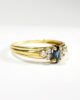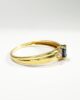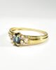 Sublime bague des années 50 en or 18 carats présentant un sublime saphir taille ovale de 0,05 carat en serti griffe auréolé de 3 diamants taille brillant de 0,015 carats de part et d’autre. Centré sur un anneau en or jaune godronné, ce motif révèle un contraste entre la blancheur des diamants, la chaleur de l’or jaune et le bleu profond du saphir.