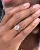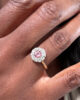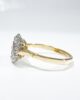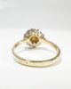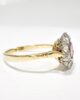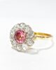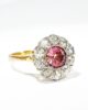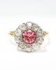 Sublime bague marguerite du début du XXème siècle en or jaune 18 carats sertie d’une sublime tourmaline rose taille brillant d’un carat en serti clos dans un entourage de diamants taille brillant de 0,08 carats chacun, de pureté VVSI et de couleur G (quasi incolore). Serties sur un chaton en or blanc ajouré, ces pierres forment une pièce élégante et féminine, où la couleur rose orangée de la tourmaline contraste joliment avec la blancheur des diamants et avec la chaleur de l’or jaune de son anneau.