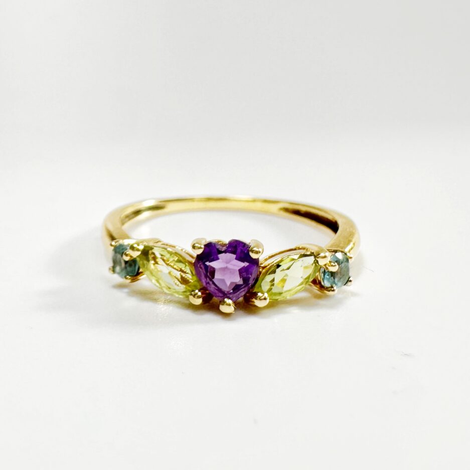 Sublime bague en or 18 carats de style Tutti Frutti pastel présentant une améthyste taille cœur encadrée e part et d’autres par un péridot taille navette et une aigue marine taille brillant d’environ 0,2 carats, en serti griffe. Ce motif coloré et joyeux central est terminé par un anneau en or miroitant pour un contraste lumineux,