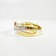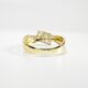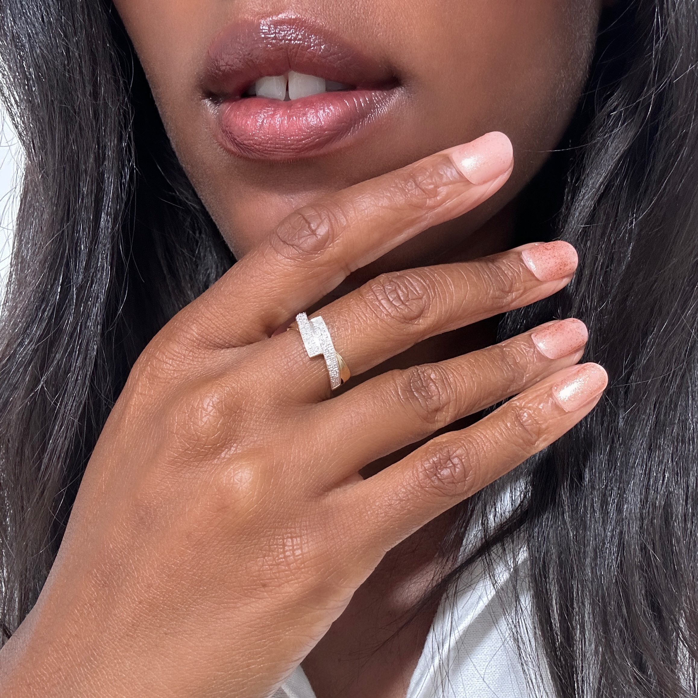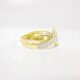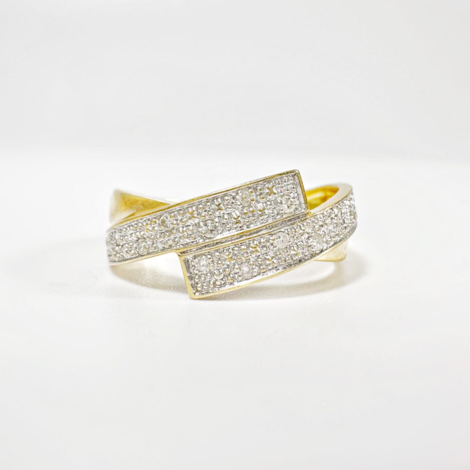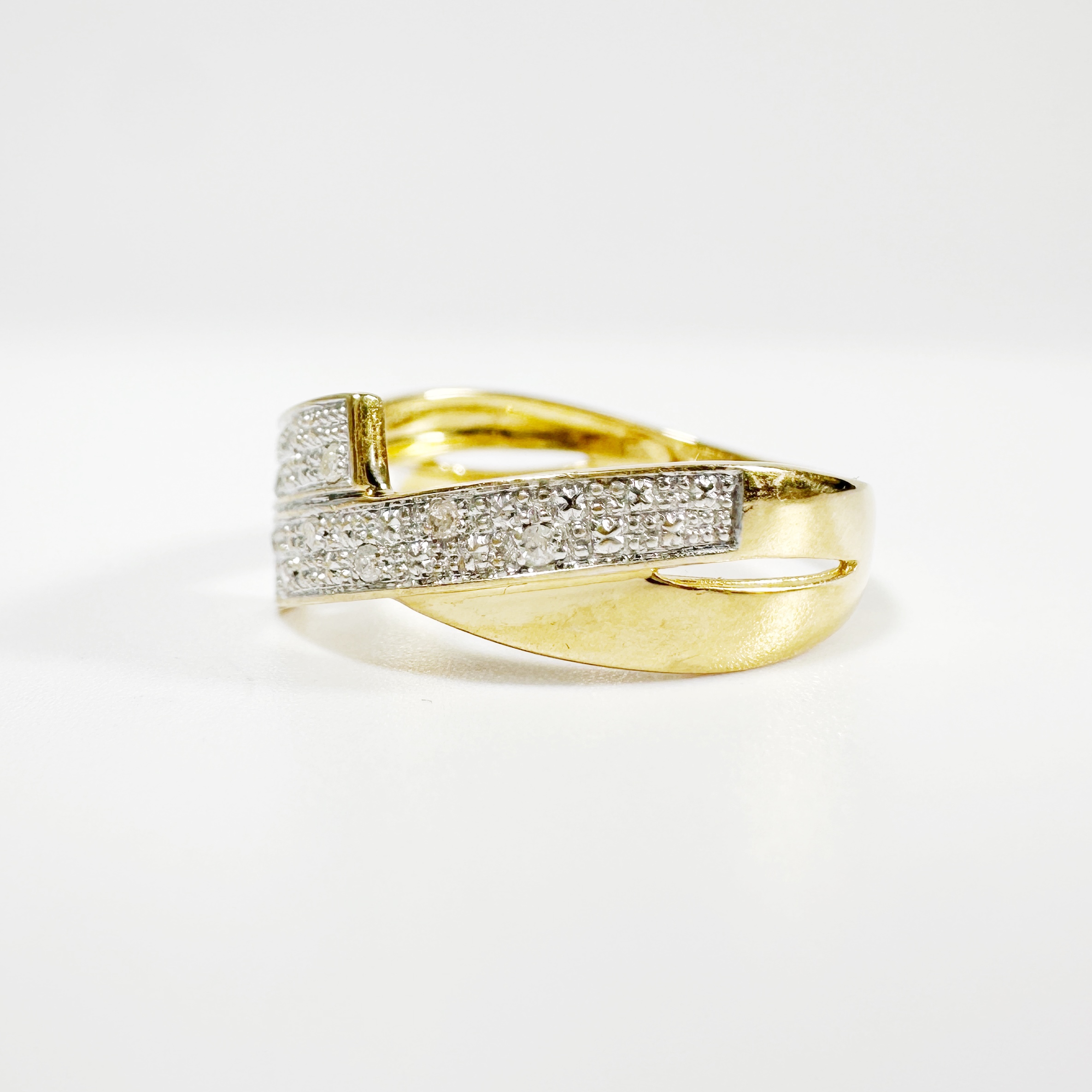 Sublime bague des années 70 en or 18 carats formée de doubles rubans, l’u en or jaune, l’autre en or blanc pavé de diamants 8×8 (12 diamants au total) se rejoignant au centre de la bague. Une pièce à la fois sophistiquée et minimaliste, où l’or jaune contraste subtilement avec l’or blanc et le diamant pour épouser le doigt harmonieusement.