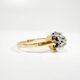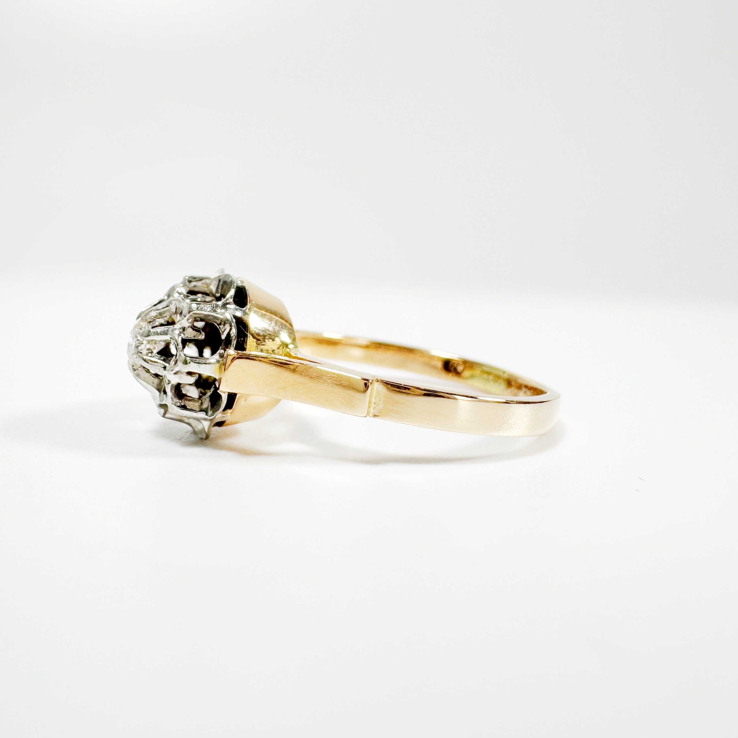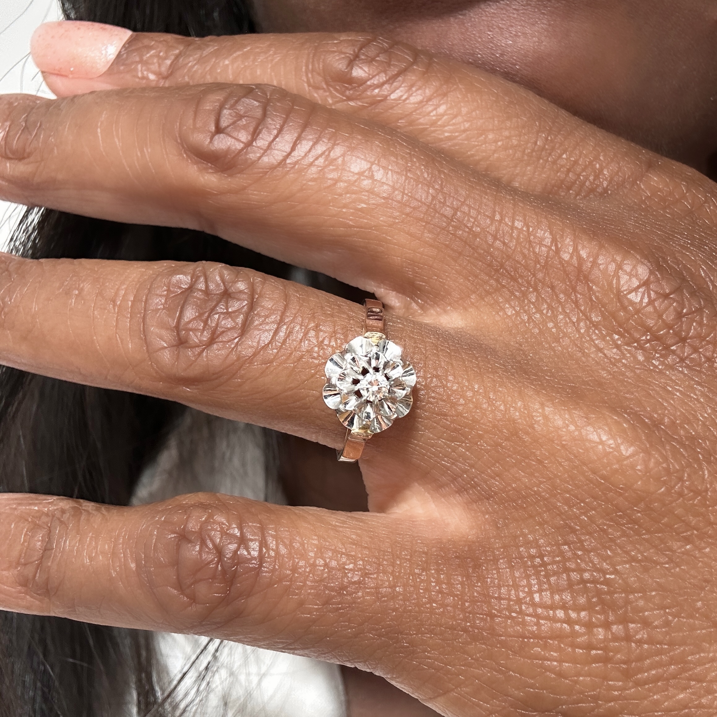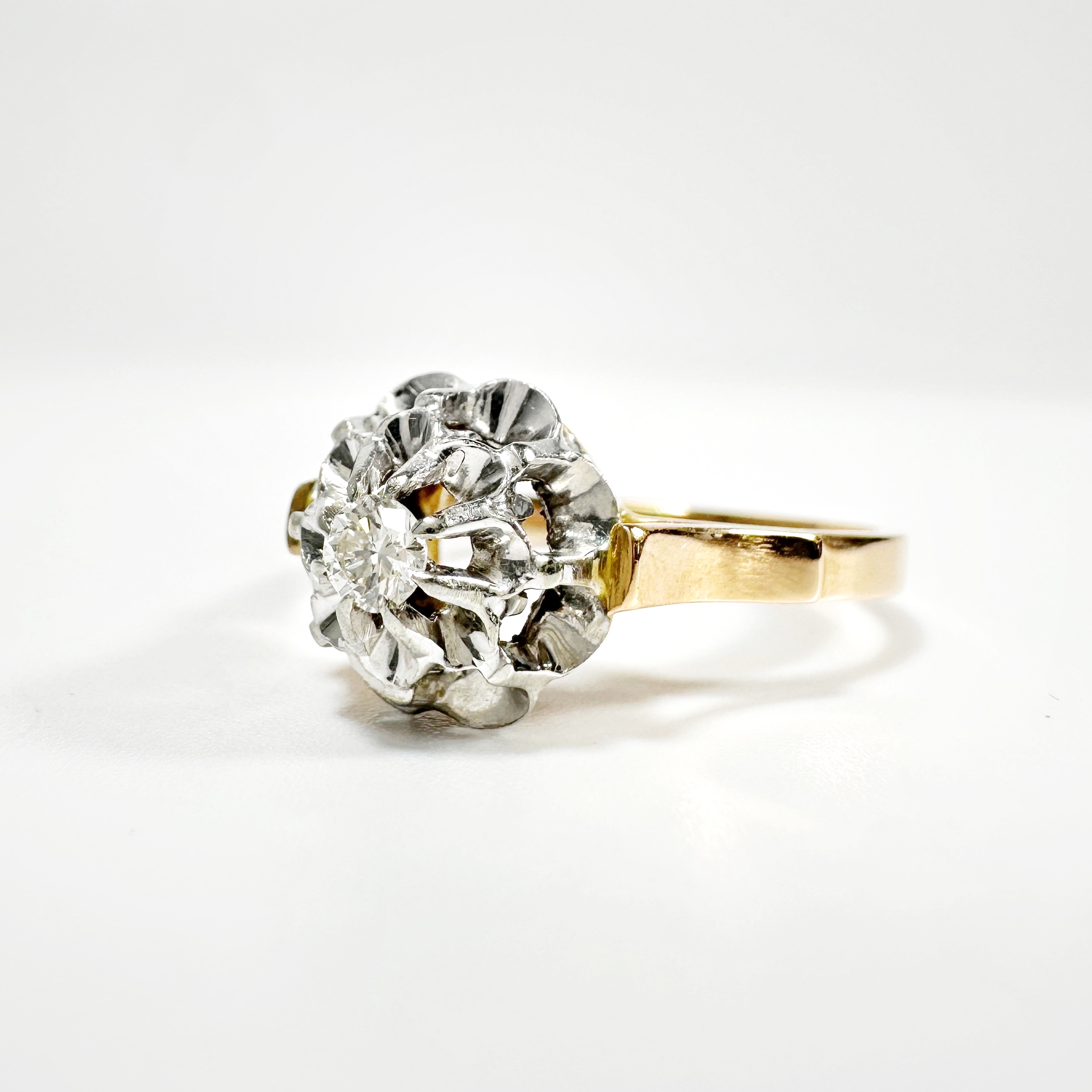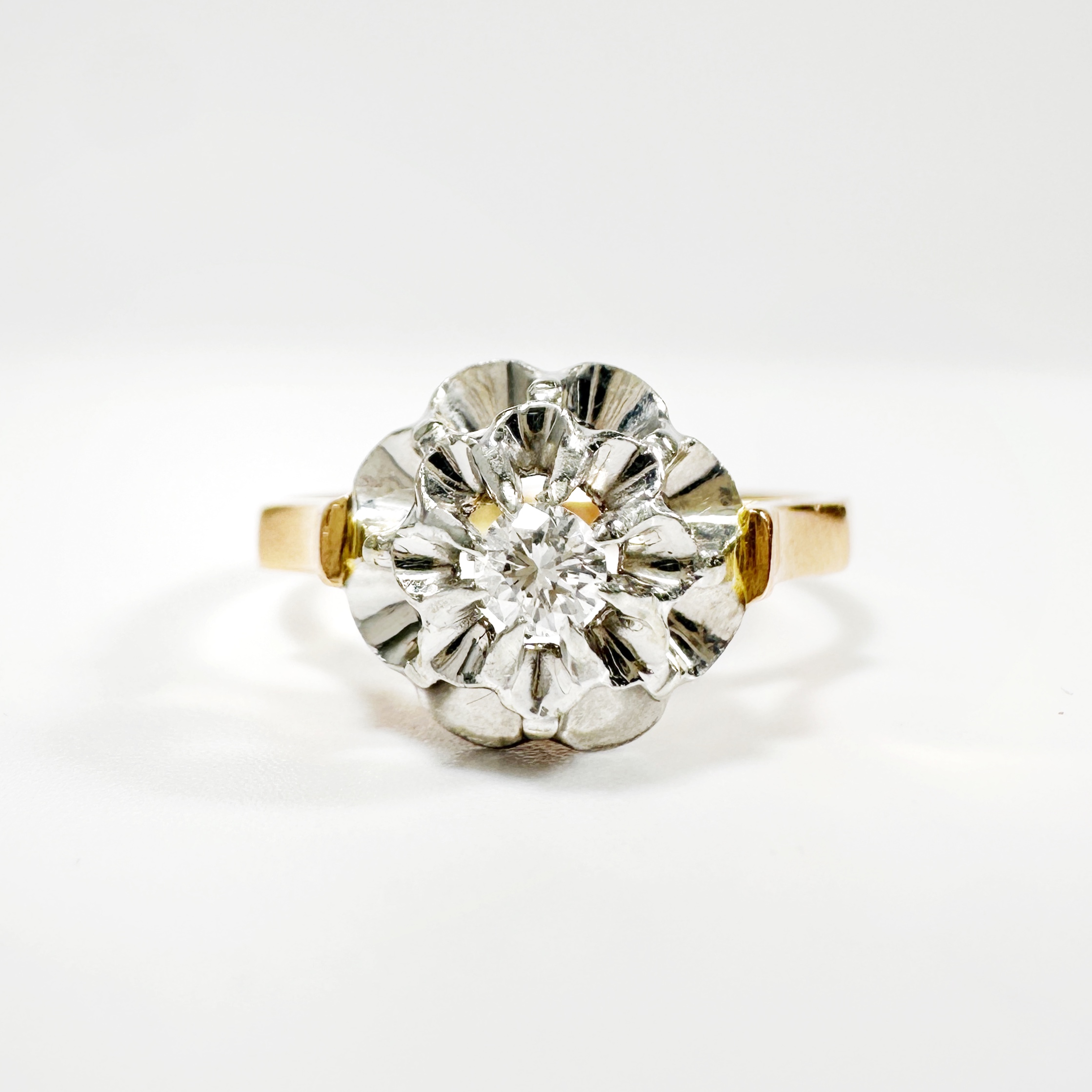 Sublime bague solitaire des années 50 en or jaune 18 carats sertie d’un sublime diamant taille brillant de 0,08 carats en serti griffe. Le chaton en platine, travaillé en corolle à double halo, confère lumière et éclat au diamant et contraste subtilement avec l’or rosé de l’anneau, La bague de fiançailles par excellence, dont le feu de la pierre offre un jeu de lumière constant et captivant. Un bijou éternel pour une vœu d’amour qui l’est tout autant,