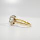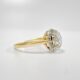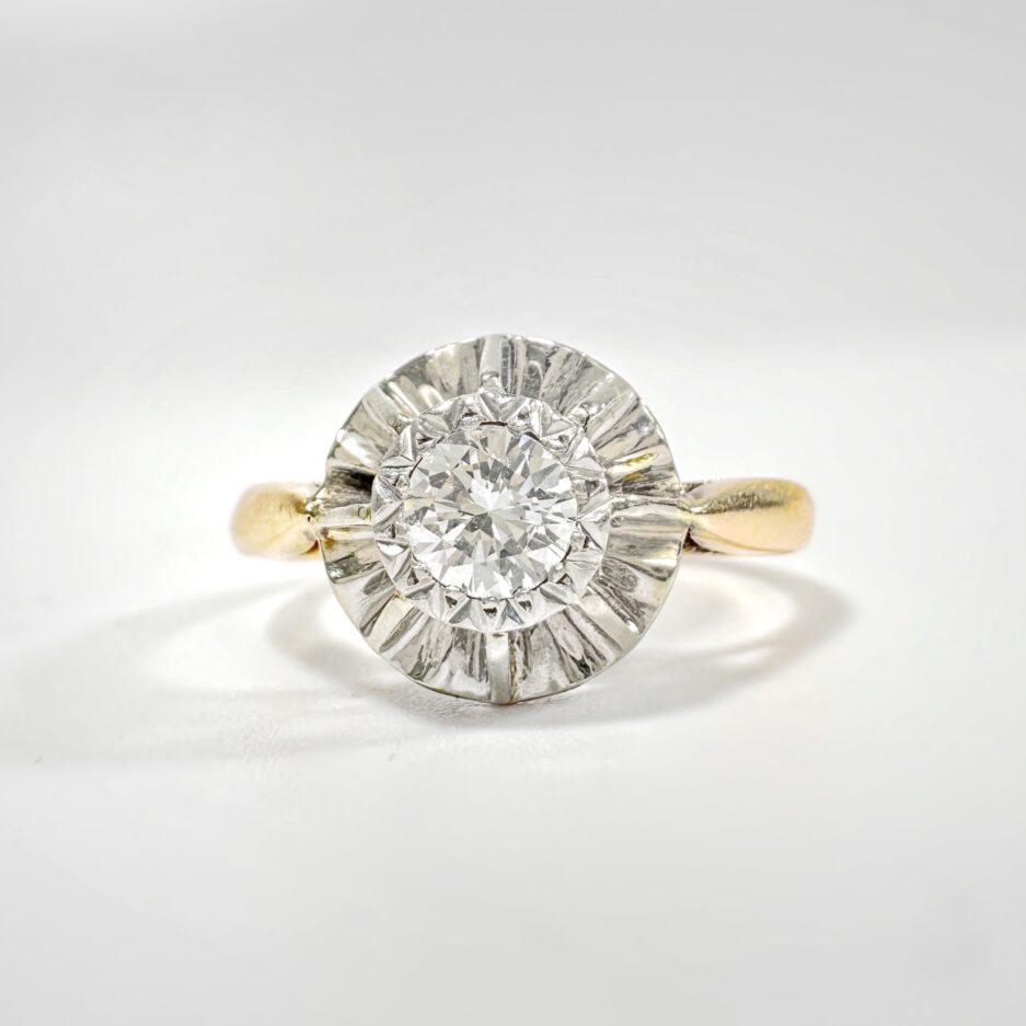 Sublime bague solitaire des années 40 en or jaune 18 carats sertie d’un sublime diamant taille brillant de 0,28 carats VVSI et couleur H (incolore) en serti illusion. Le chaton en platine, travaillé en corolle, confère lumière et éclat au diamant et contraste subtilement avec l’or rosé de l’anneau. La bague de fiançailles par excellence, dont le feu de la pierre offre un jeu de lumière constant et captivant. Un bijou éternel pour un vœu d’amour qui l’est tout autant.