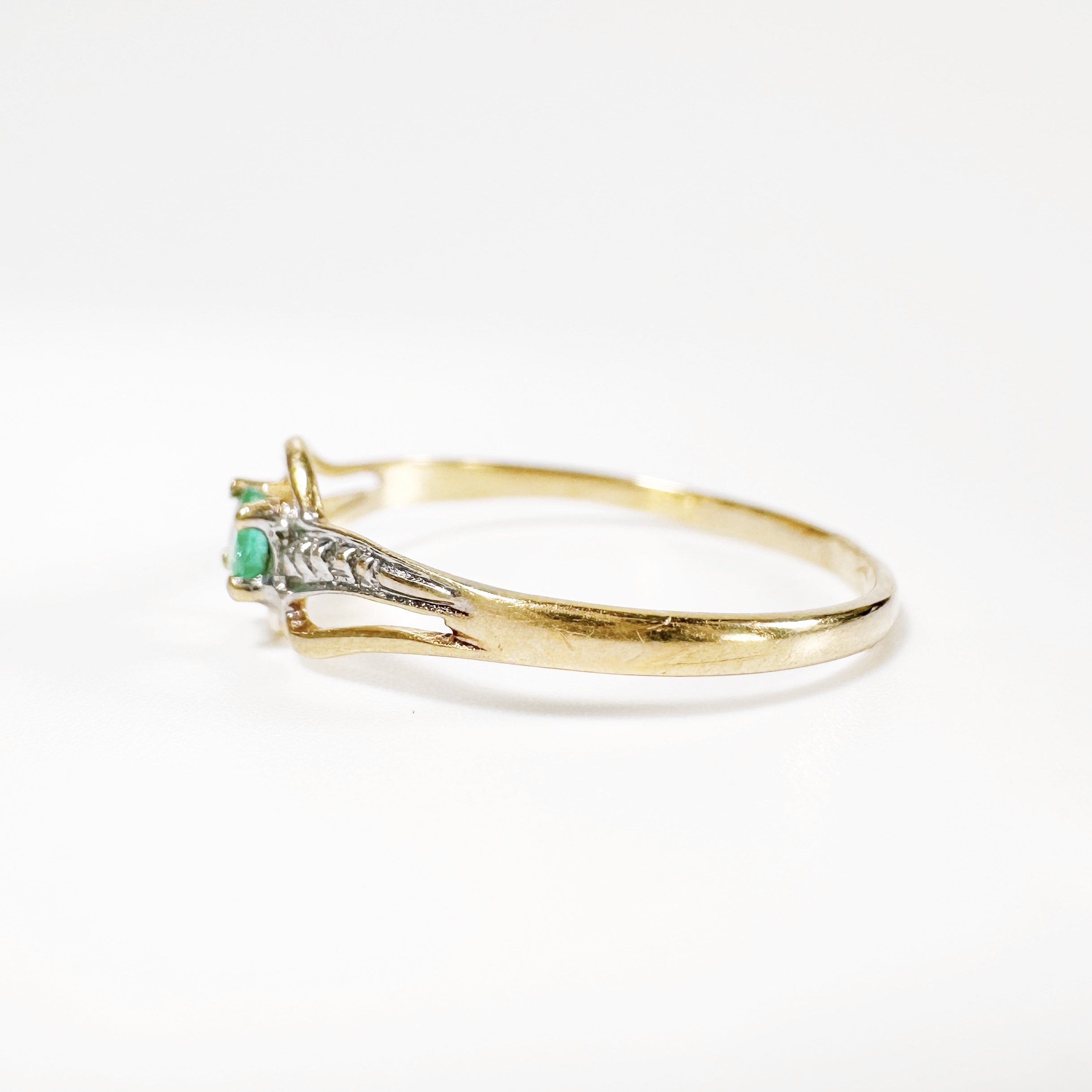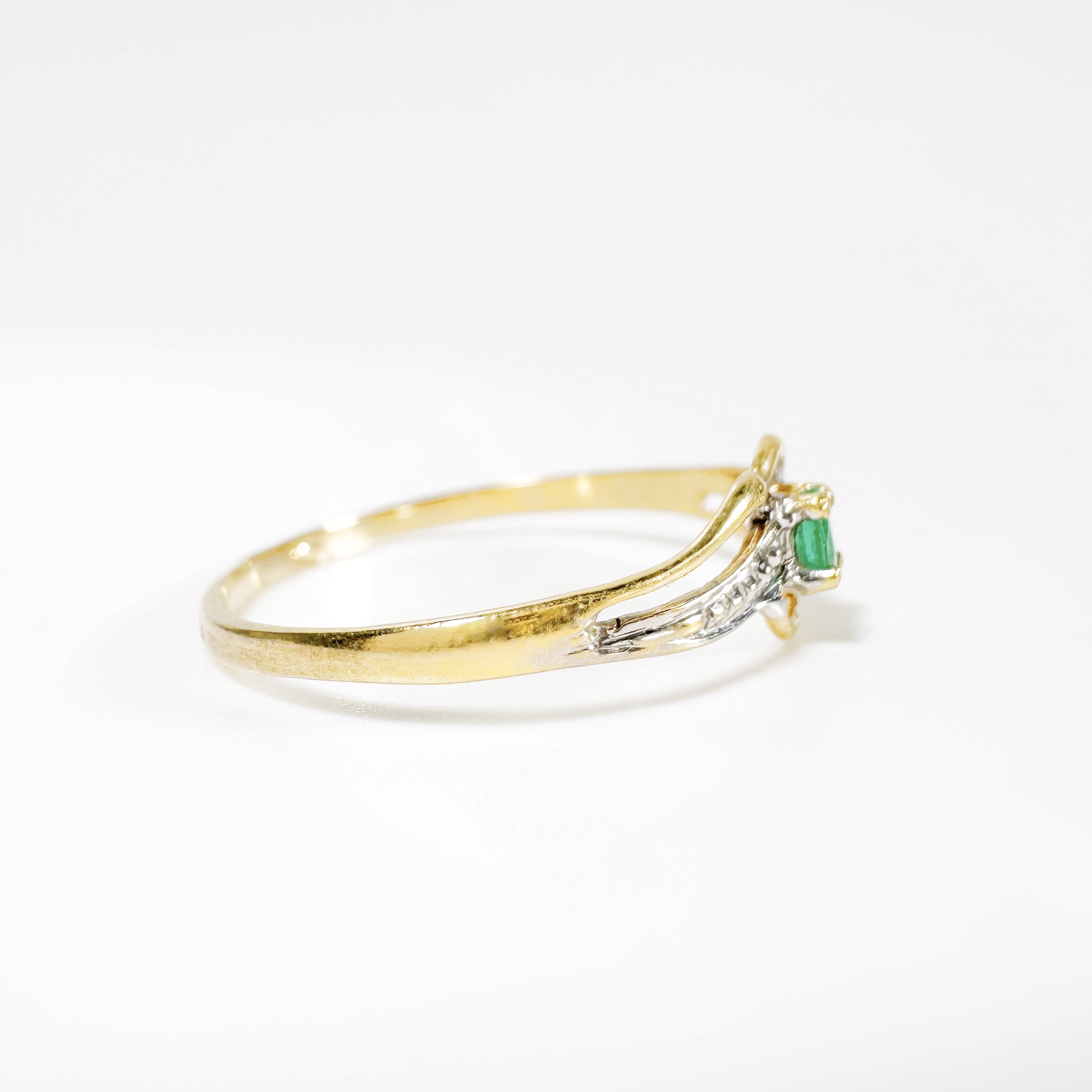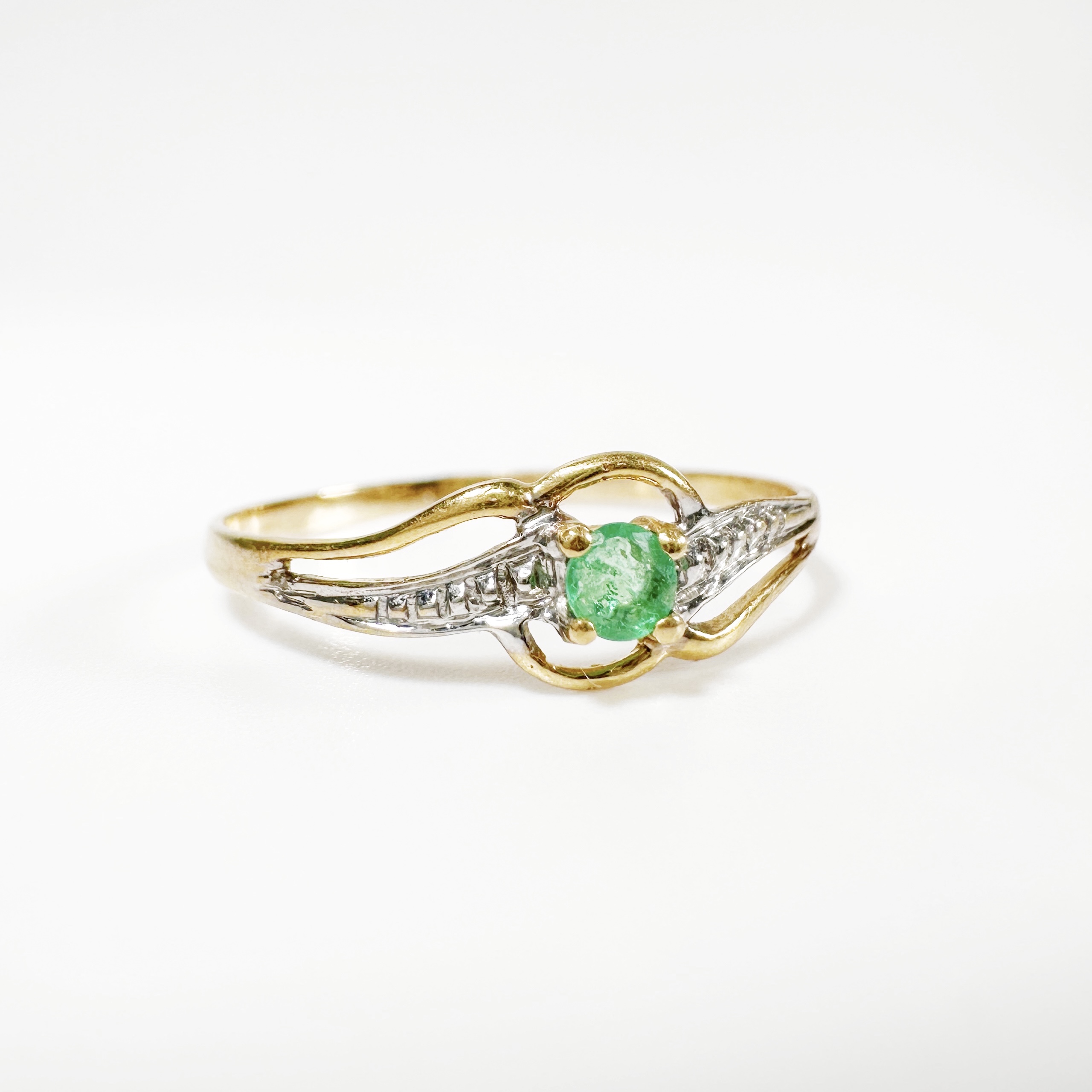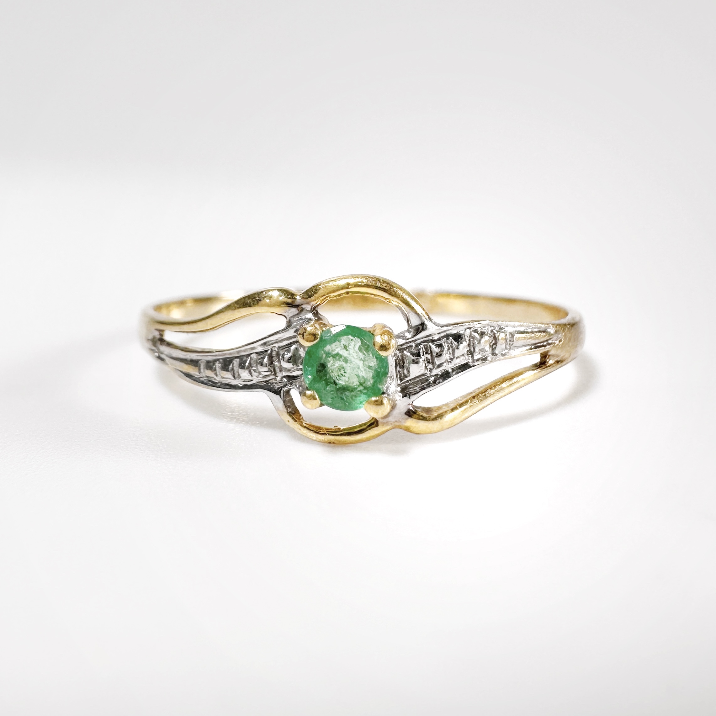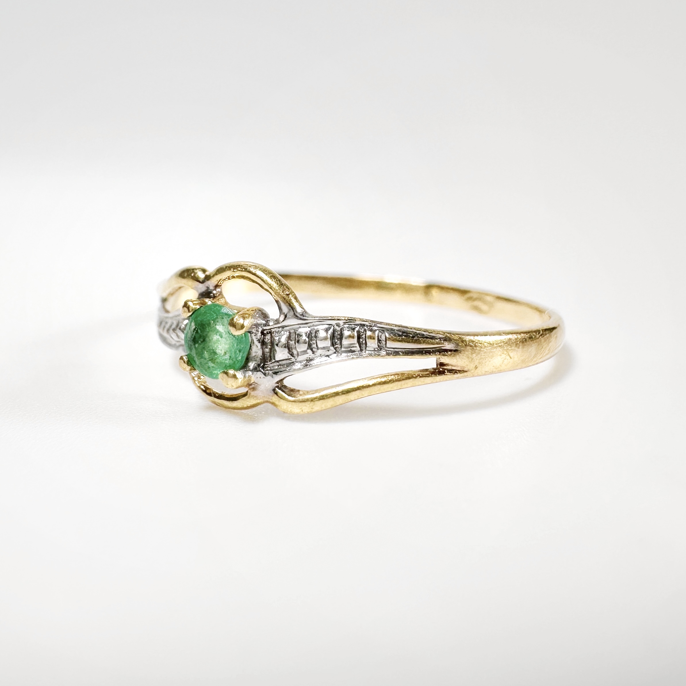 Elégante bague des années 60 en or 18 carats centré d’une émeraude vert jardin taille brillant d’environ 0,15 carats en serti griffe sur un chaton entouré de lignes ciselées. Ce motif central repose sur un anneau simple encadrant la pierre de lignes en or blanc à fini diamant. Une pièce féminine toute en courbes voluptueuses et exaltant la beauté vibrante de l’émeraude.