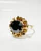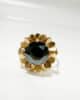 Imposante bague des années 50 en or jaune 18 carats sertie d’une hématite taille brillant de 2 carats. Sertie en griffe, la pierre d’un noir métallique est auréolée d’or facetté et ciselé pour un effet des plus lumineux et captivants.