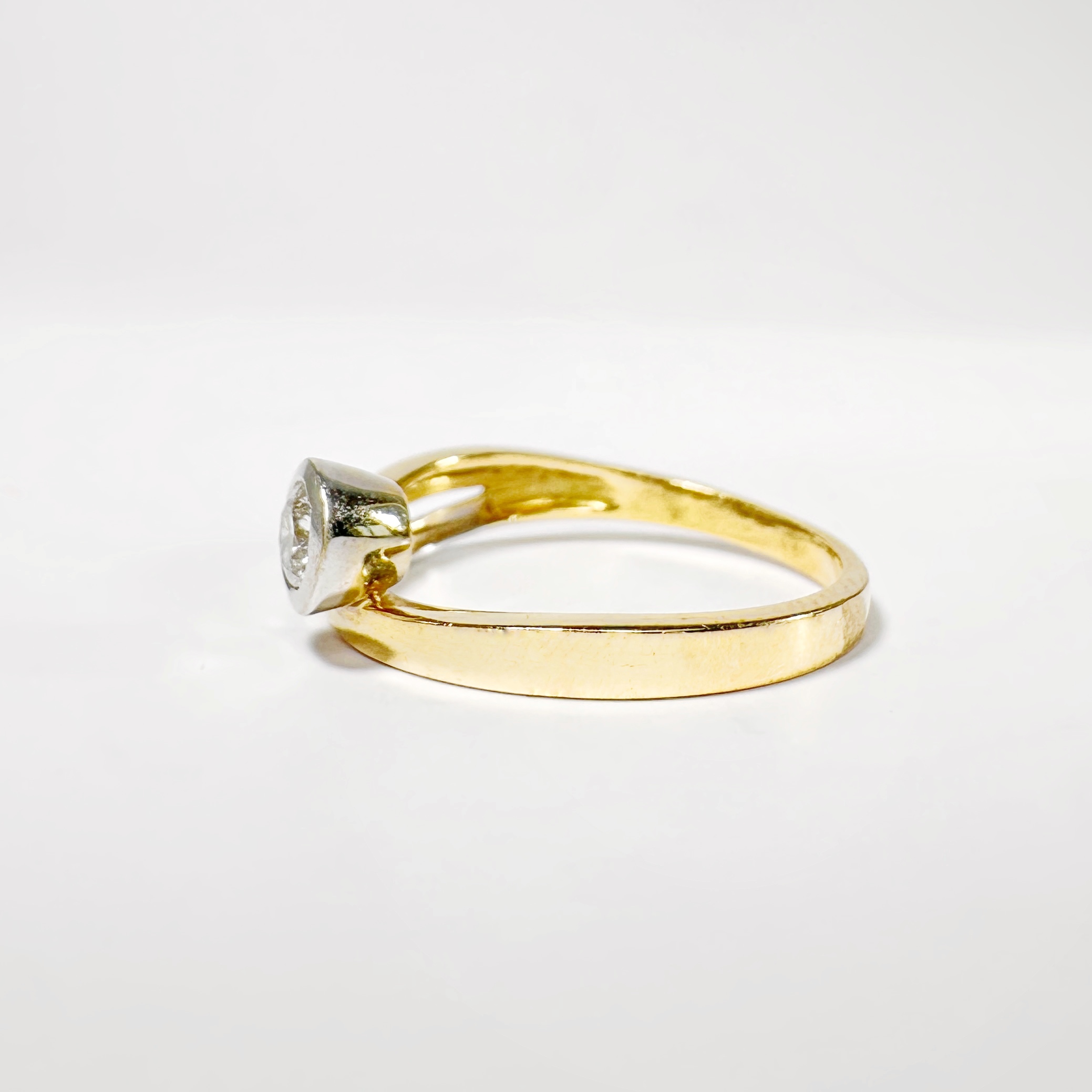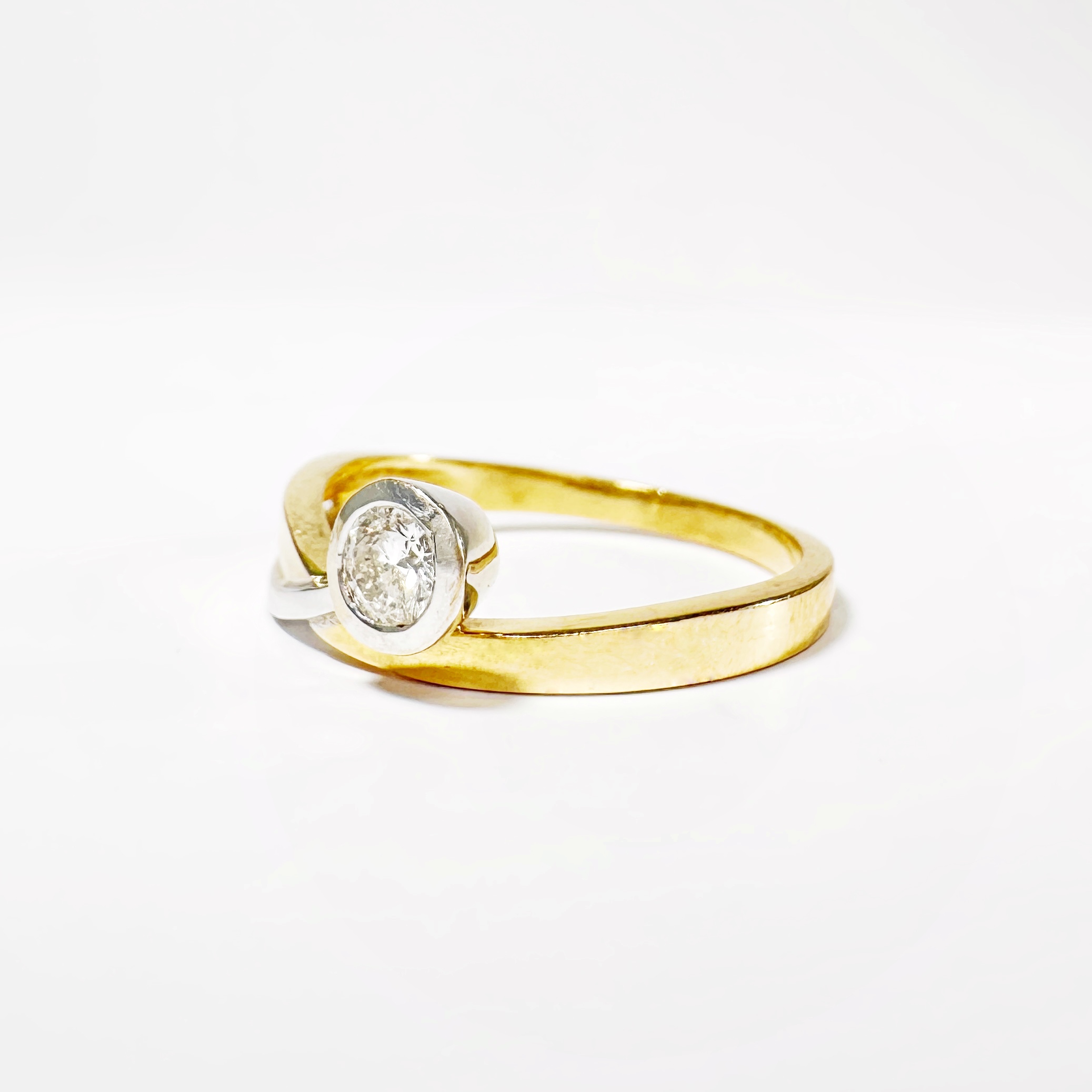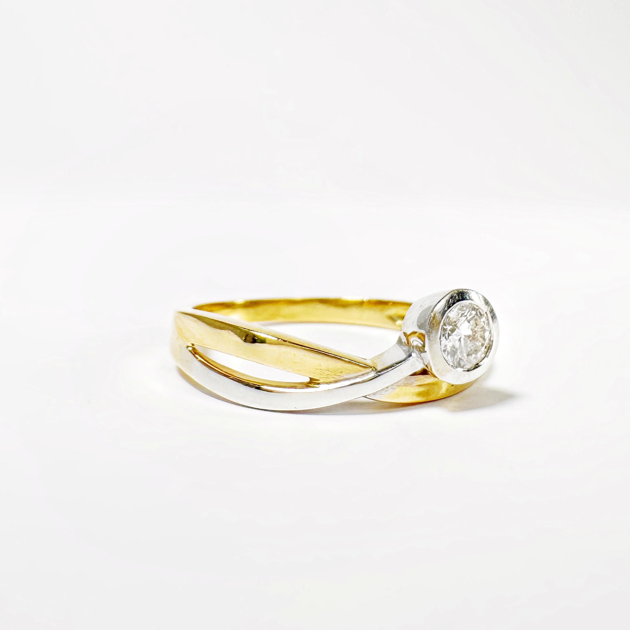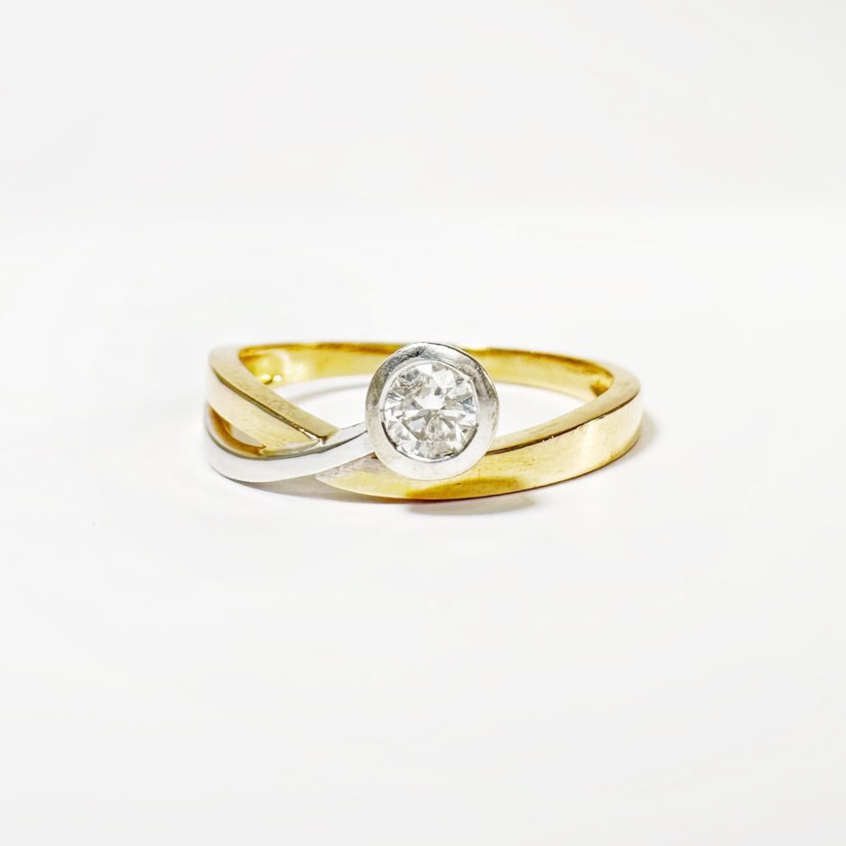 Sublime bague ruban des années 70 formée d’un anneau en or jaune suivant un motif de vague tandis qu’une branche en or blanc émerge de l’anneau principal, sertie d’un diamant taille brillant de 0,2 carats pureté VVSI et couleur F (incolore). En serti cos, ce sublime diamant offre une version minimaliste et moderne du classique solitaire en diamant, sublimé par le contraste de l’or jaune et de l’or blanc, qui se mariera ainsi avec vos pièces en or quel que soit leur ton.