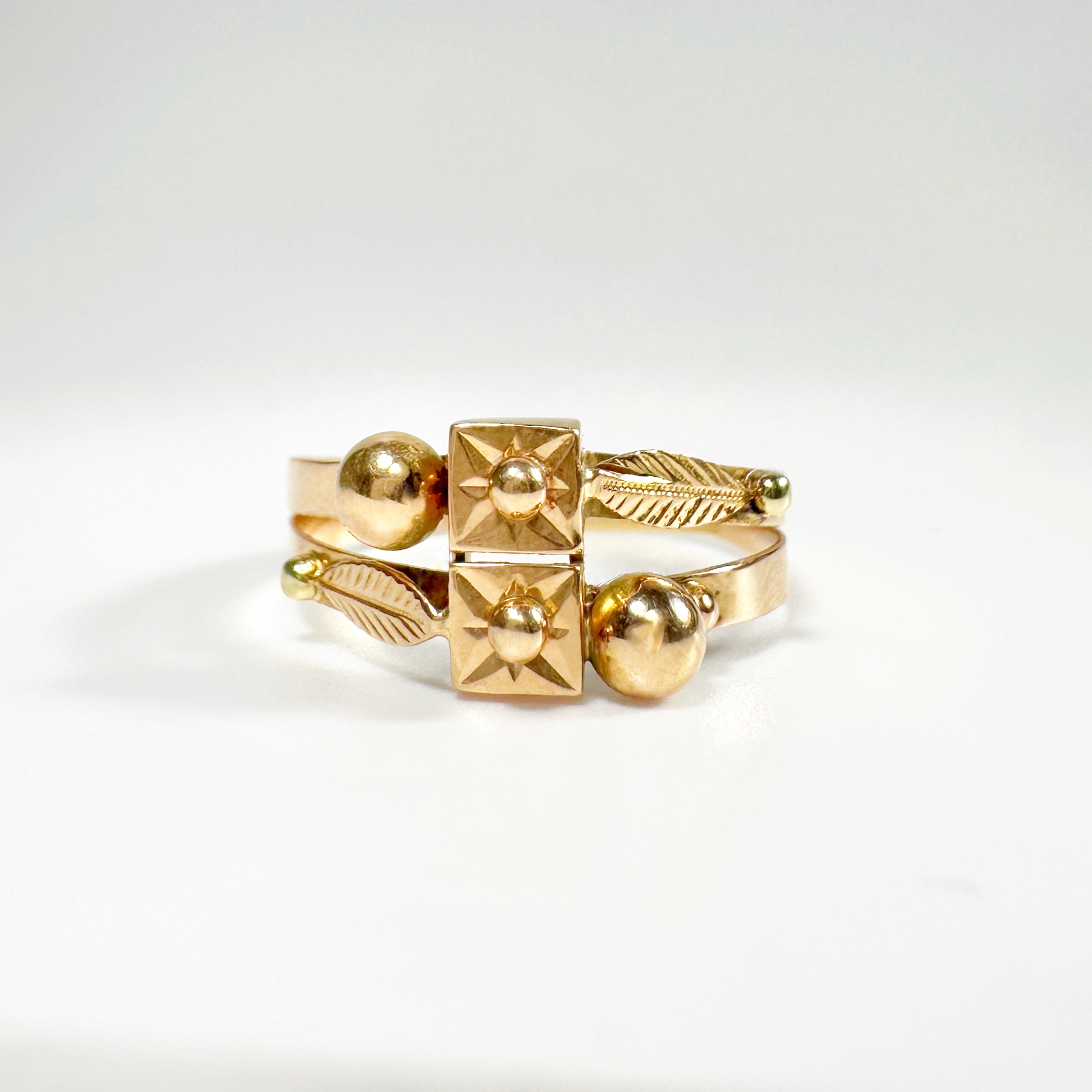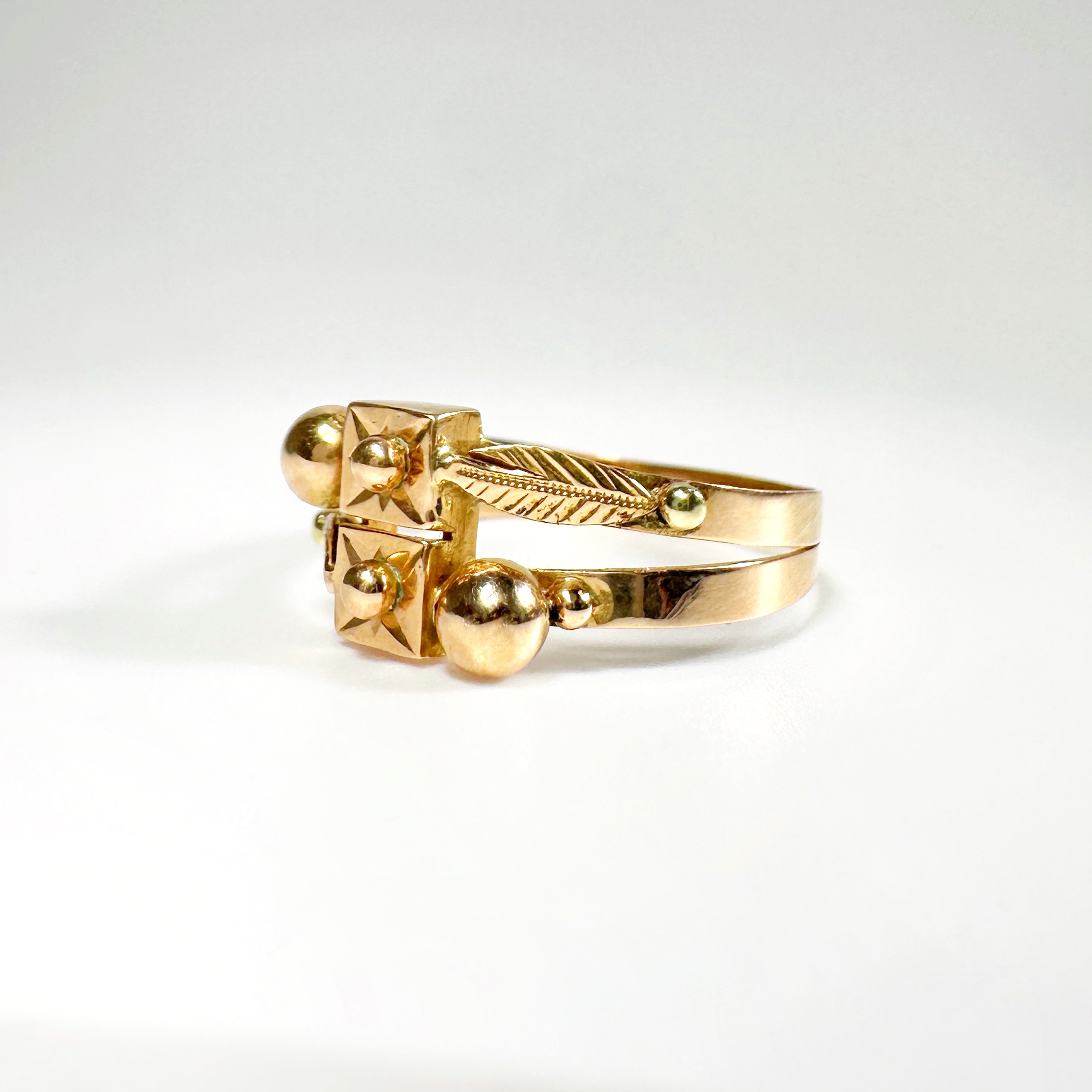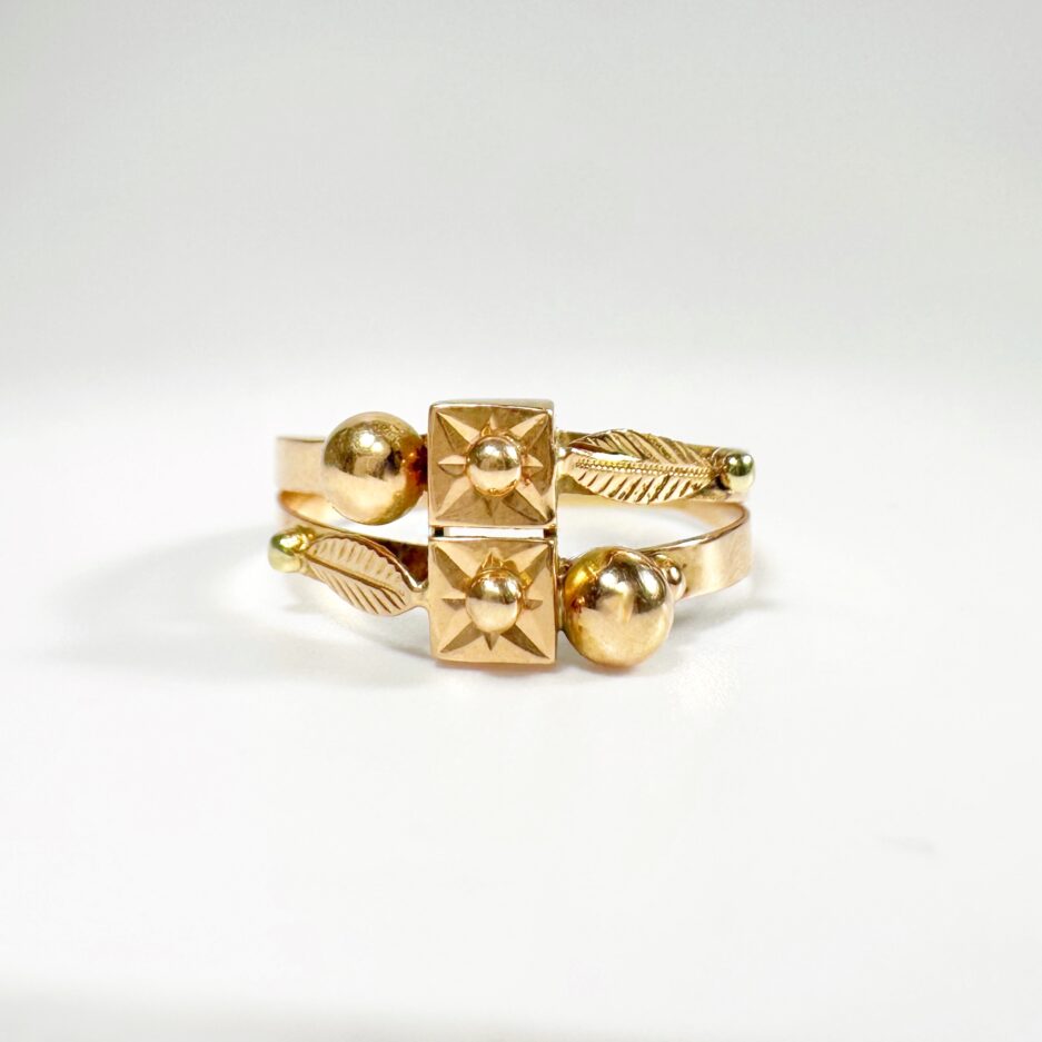 Sublime bague du XIXème siècle (époque Bonaparte) en or 18 carats de style Toi et Moi. Son anneau en or rosé formé par deux motifs de feuillage est centré de deux cubes centrant une bille en or et encadrées du motif de billes d’or et feuillages.
