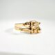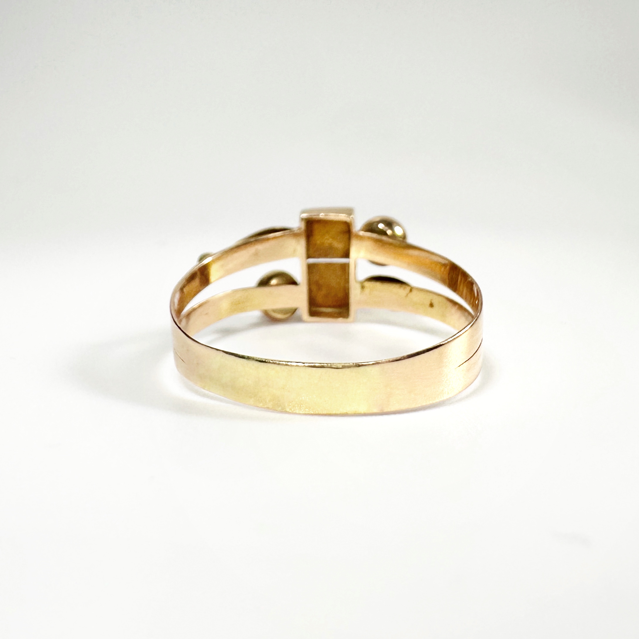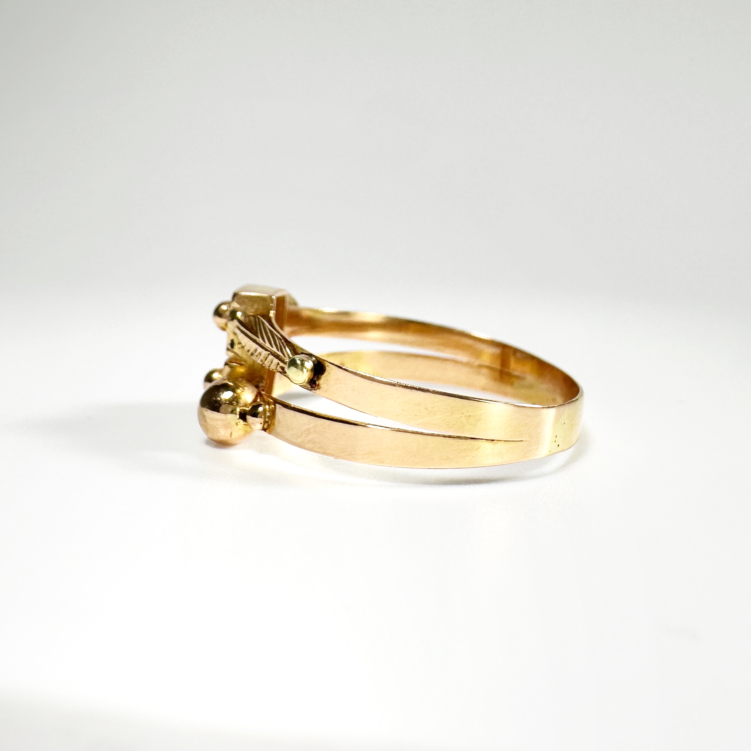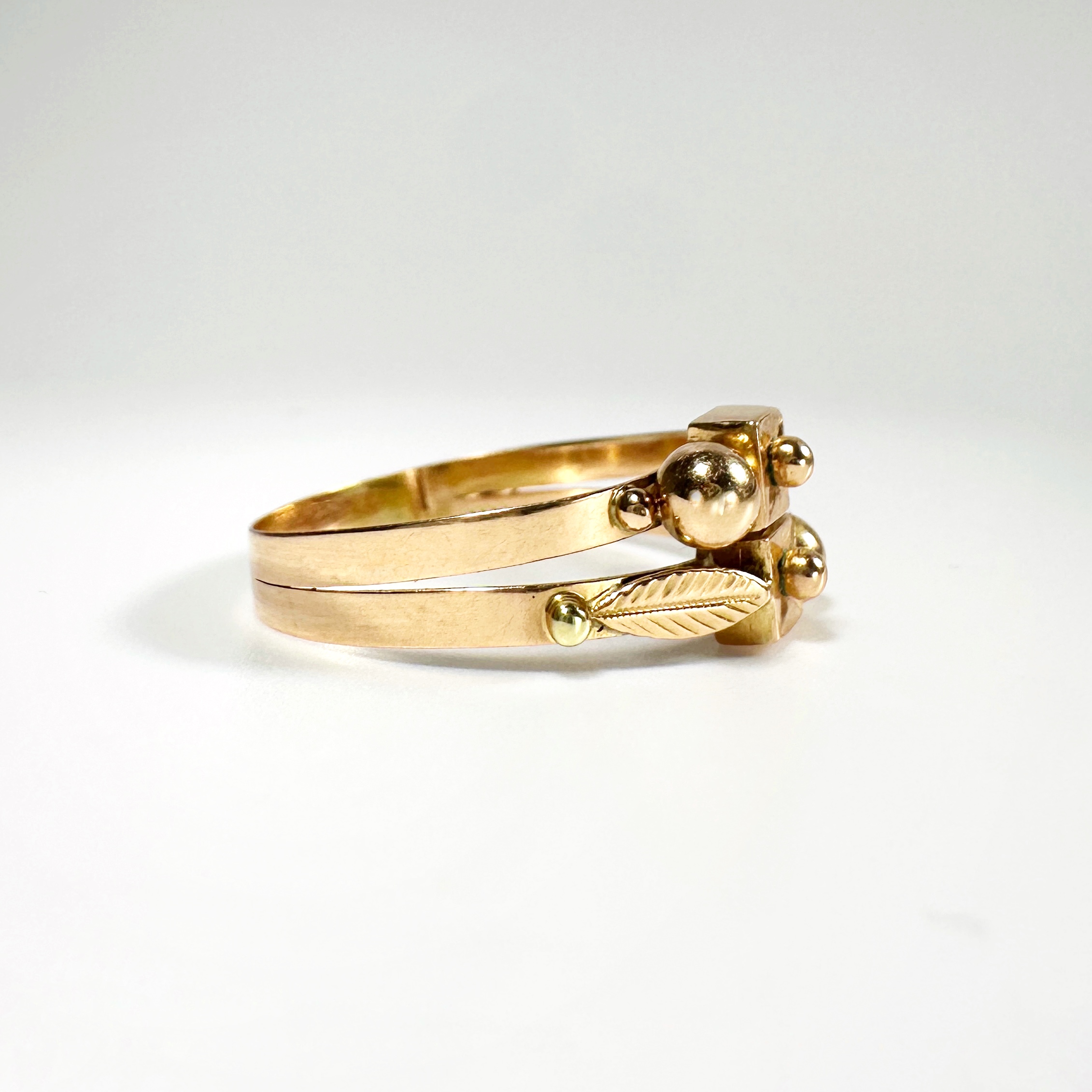 Sublime bague du XIXème siècle (époque Bonaparte) en or 18 carats de style Toi et Moi. Son anneau en or rosé formé par deux motifs de feuillage est centré de deux cubes centrant une bille en or et encadrées du motif de billes d’or et feuillages.