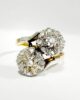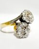 Sublime bague du XIXème siècle en or 18 carats de style Toi et Moi présentant deux rosaces chacune serties de 9 diamants taille rose d’environs 0,02 carats en serti griffe sur or blanc. Reposant sur un chaton ouvert et ciselé pour leur apporter éclat et lumière, ces motifs s’embrassent au centre sur un anneau en or jaune et aux épaules en or blanc. Une pièce toute en finesse, typique du charme du courant XIXème siècle en France,