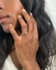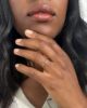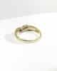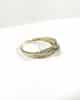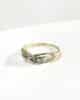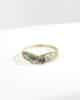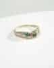 Sublime bague des années 70 en or 18 carats présentant une succession de pierres précieuses taille brillant d’environ 0,05 carats: un saphir, un rubis et une émeraude se succèdent au centre de la bague. Son anneau est surligné de deux courbes en or blanc serties de part et d’autre d’un diamant taille brillant de 0,01 carat. Une pièce élégante et joyeuse, où le contraste de l’or jaune et de l’or blanc sublime celui des ses trois pierres précieuses.