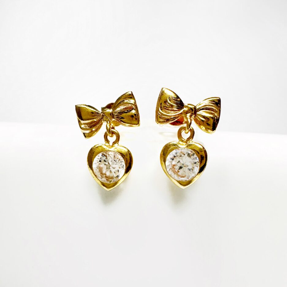 Sublime paire de boucles d’oreilles des années 70 en or 18 carats présentant un motif de cœur serti d’un saphir blanc taille brillant de 0,5 carats en serti clos surmonté d’un motif de nœud. Sécurisées par un fermoir papillon et tout en mouvement, cette paire de boucles romantiques apporte lumière et éclat au visage.*
