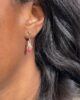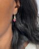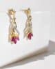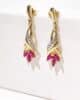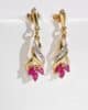 Sublime paire de boucles d’oreilles pendantes des années 50 en or jaune et blanc 18 carats sertie de rubis. Chaque boucle vintage se compose d’une puce d’oreille en or 18 carats en forme de goutte, à laquelle sont accrochés des arabesques en or jaune et blanc. Au bout de ces dernières se trouvent 3 rubis taille marquise ouo navette de 0,1 carat.