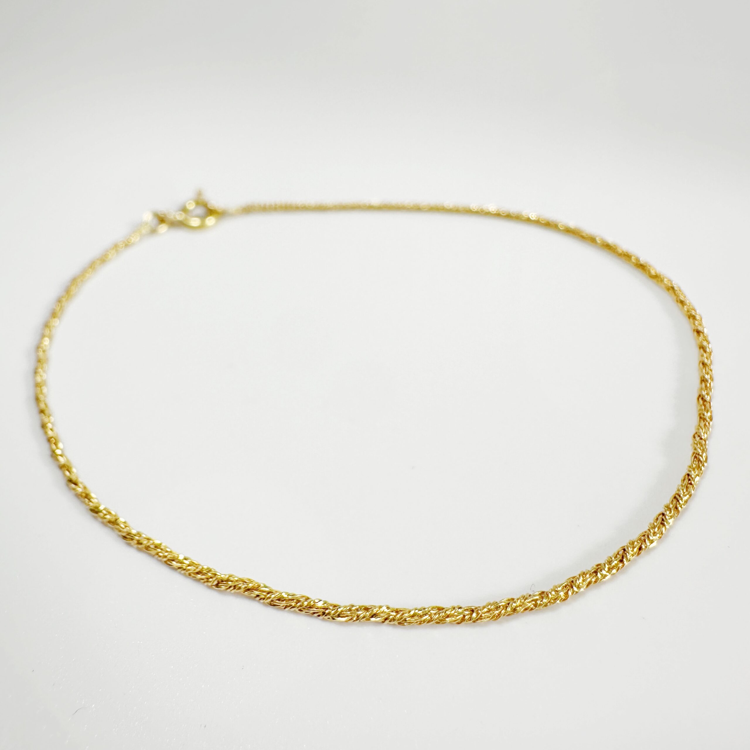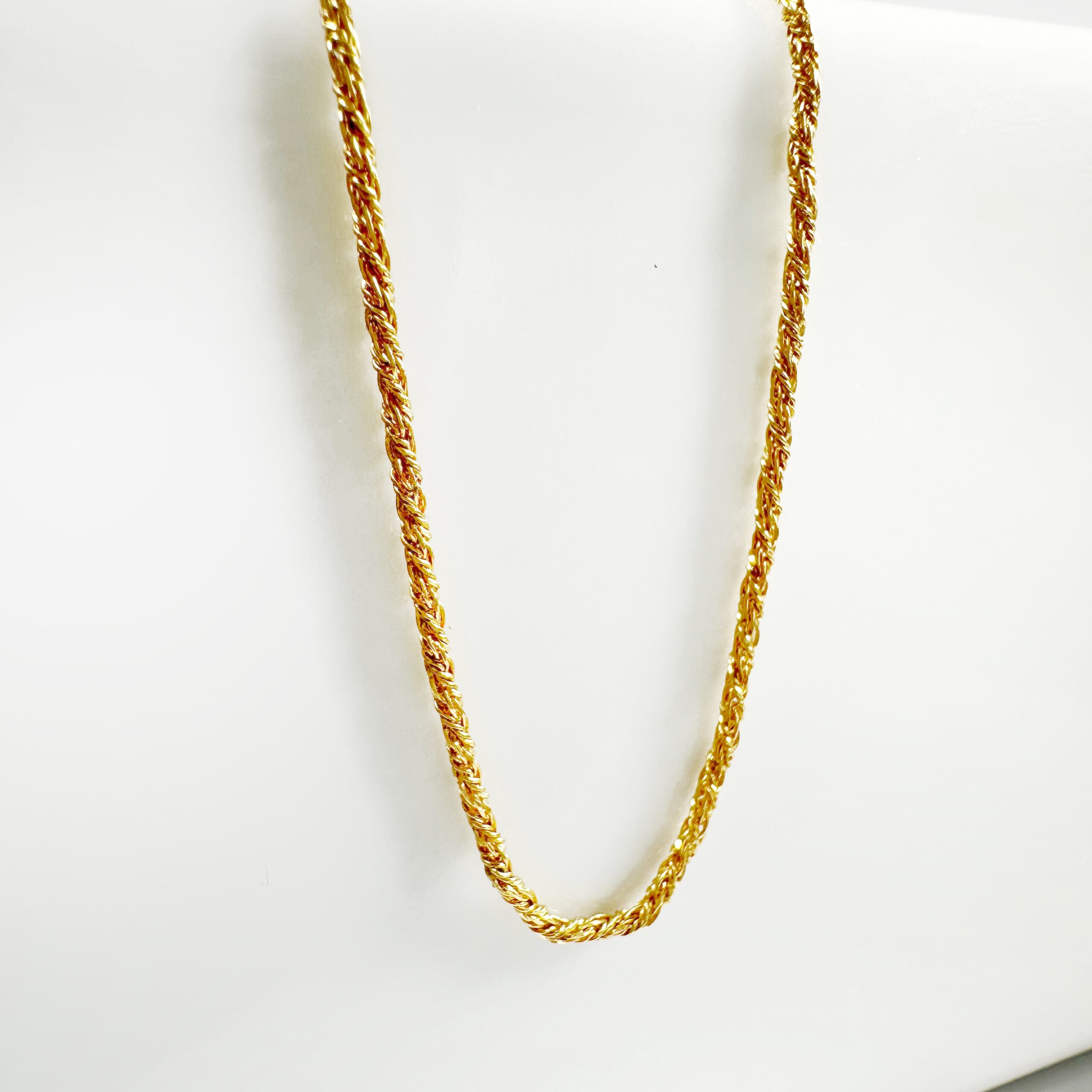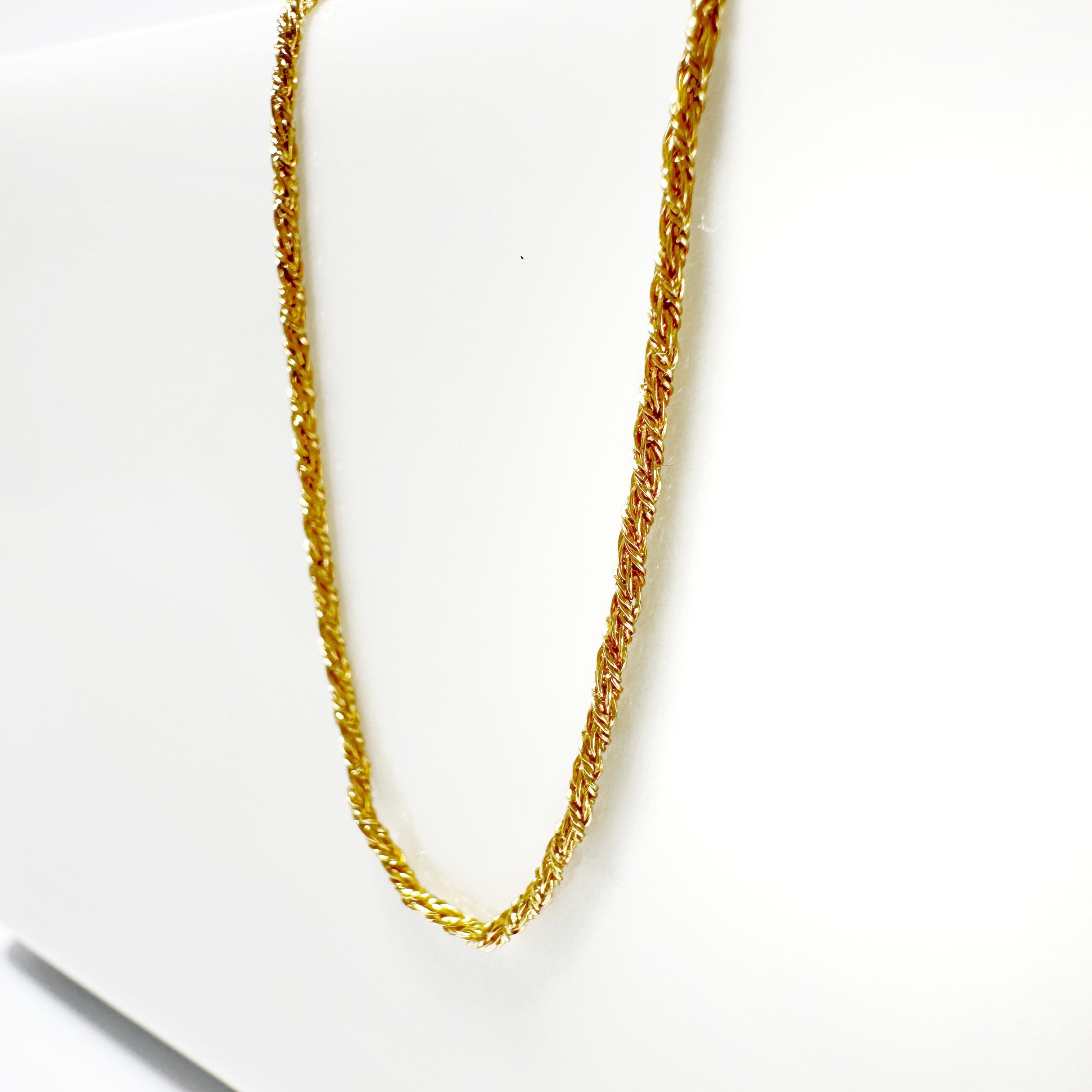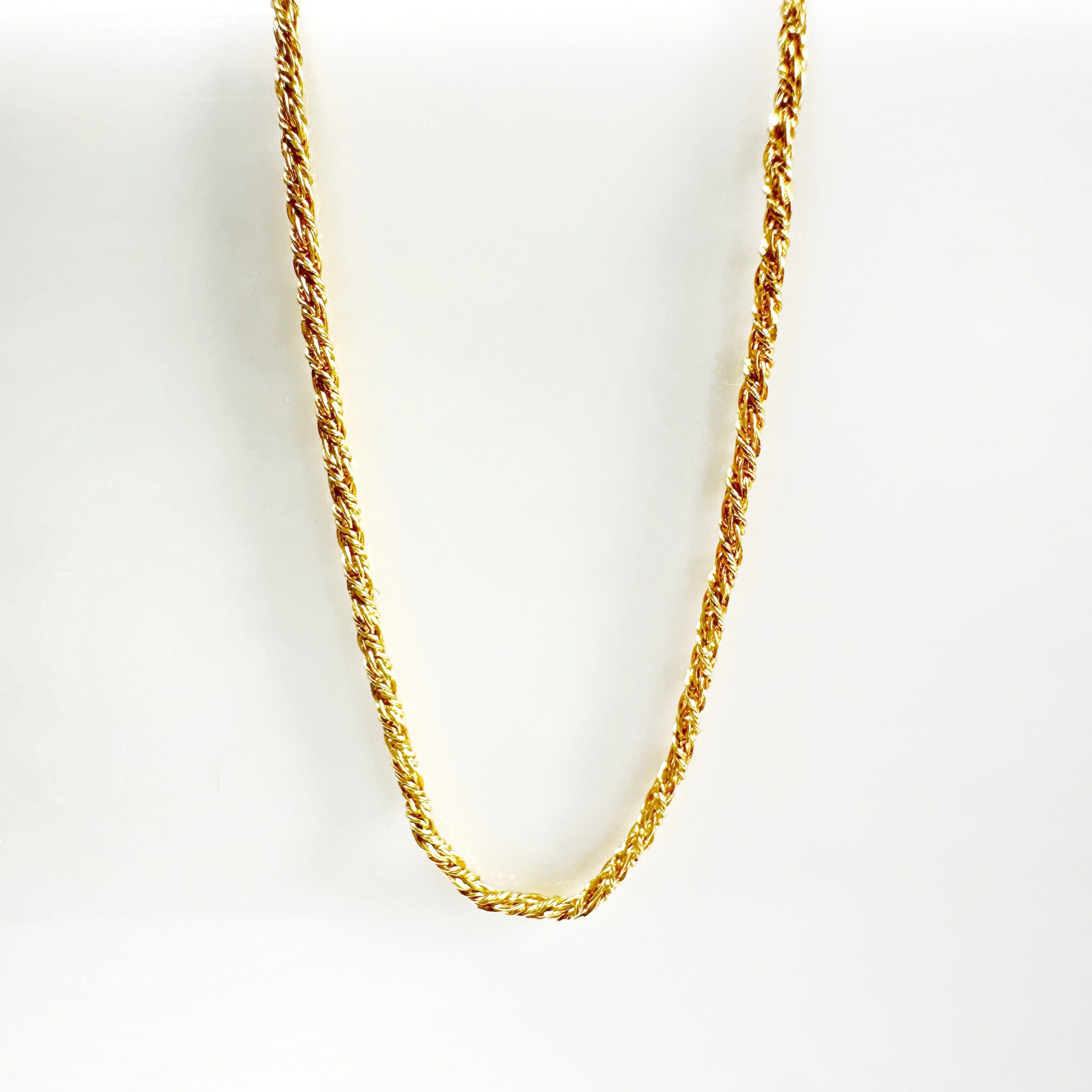 L’histoire : À la fois structuré et lumineux, le motif de la chaîne torsadée s’inspire des cordages entrelacés, dont les maillons régulièrement entrelacés évoquent force, continuité et harmonie. Utilisé depuis l’Antiquité dans diverses formes d’orfèvrerie, ce design repose sur un entrecroisement précis de maillons qui crée une surface riche en relief et en mouvement. Cette construction torsadée présente une particularité unique : elle capte et réfléchit la lumière sous de multiples angles. Chaque courbe agit comme une facette, produisant un éclat vif et scintillant, souvent comparé à celui du diamant. Ce jeu de lumière confère à la chaîne une brillance exceptionnelle, même dans sa plus grande simplicité. Appréciée à travers les époques pour sa résistance autant que pour son élégance, la chaîne torsadée incarne aujourd’hui un équilibre parfait entre technicité et raffinement — un bijou lumineux, au caractère affirmé, qui révèle toute la beauté du mouvement et de la lumière.