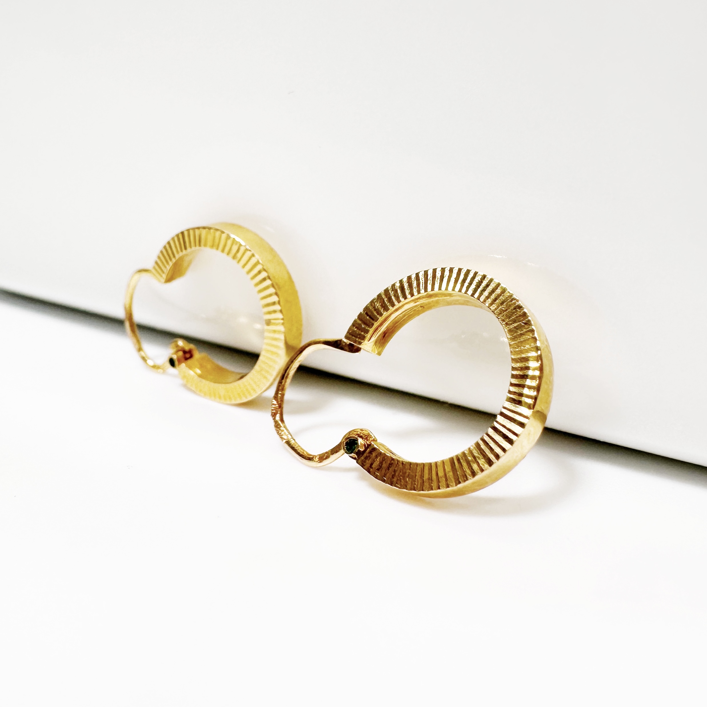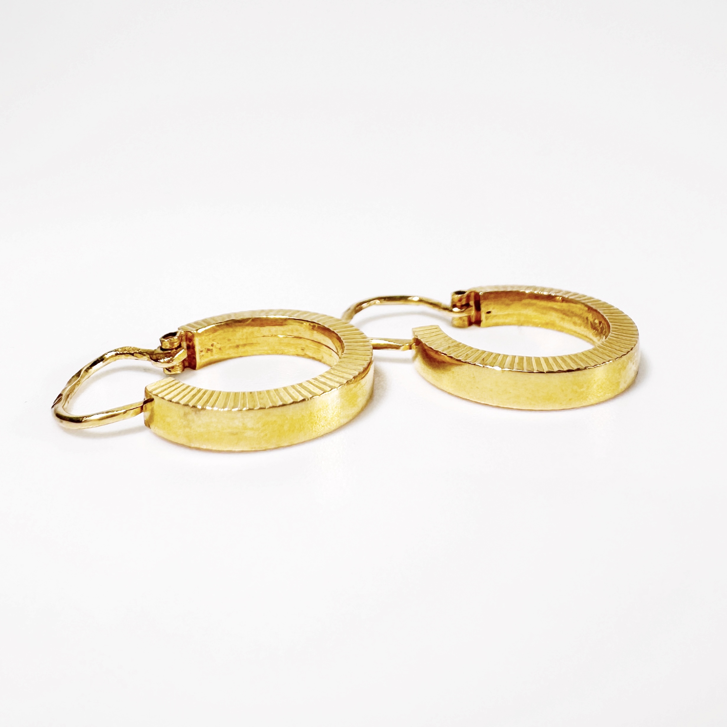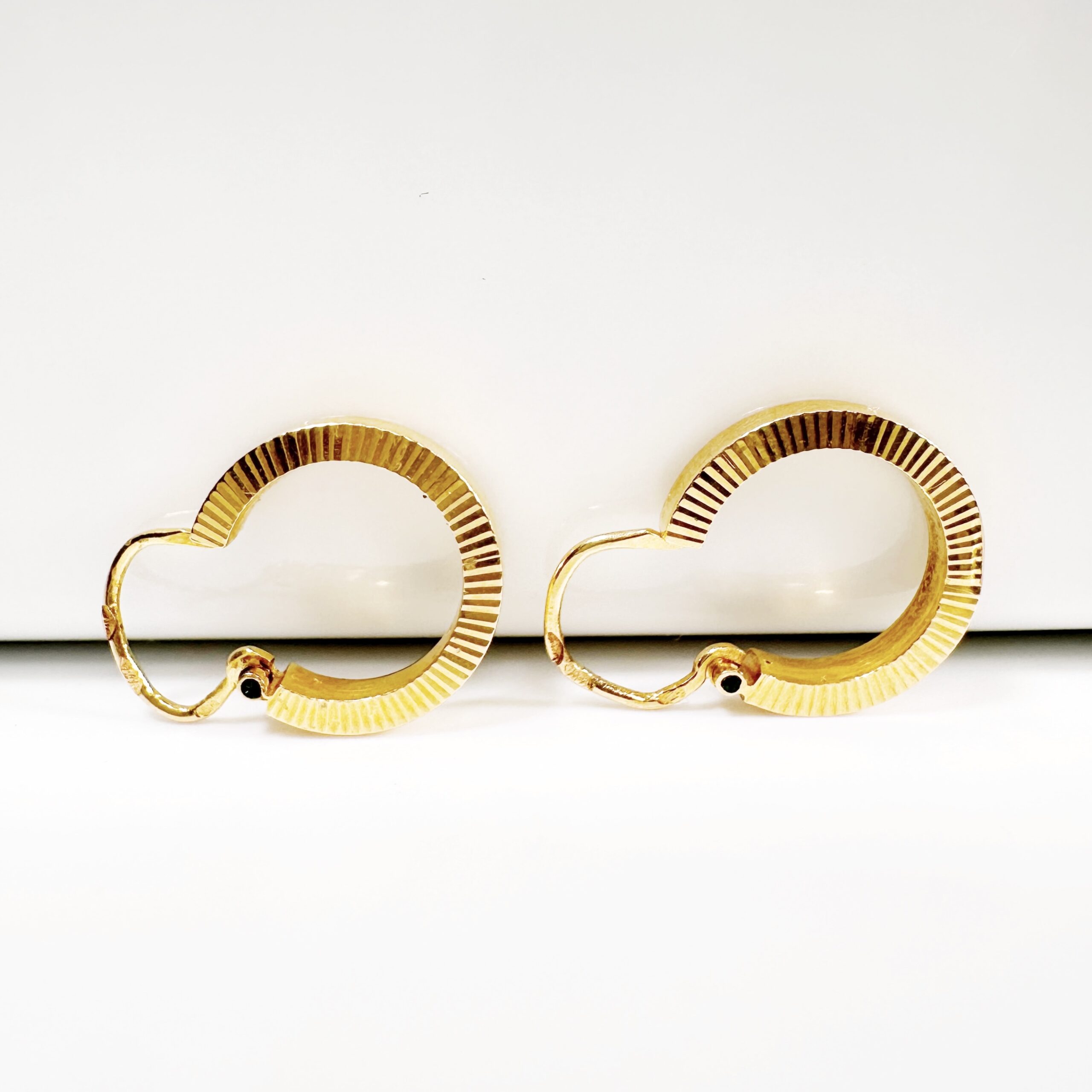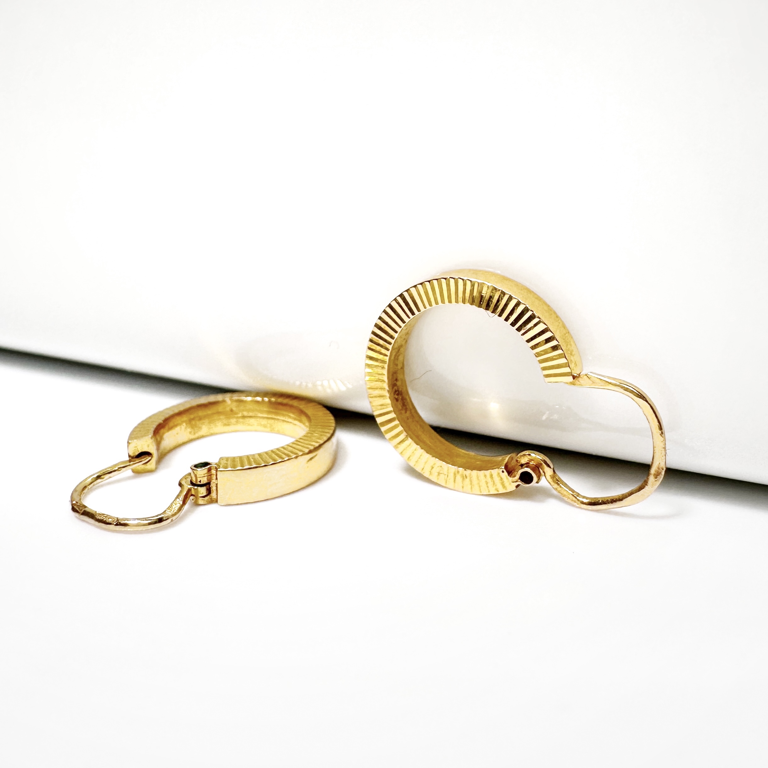 Magnifique paire de créoles en or 18 carats des années 50 dont le pourtour est décoré de rainures lui apportant un éclat scintillant et rayonnant. Une paire de boucles d’oreilles au style intemporel, à la fois élégant et facile à porter. Un classique sans lequel une collection de bijoux ne serait complète.