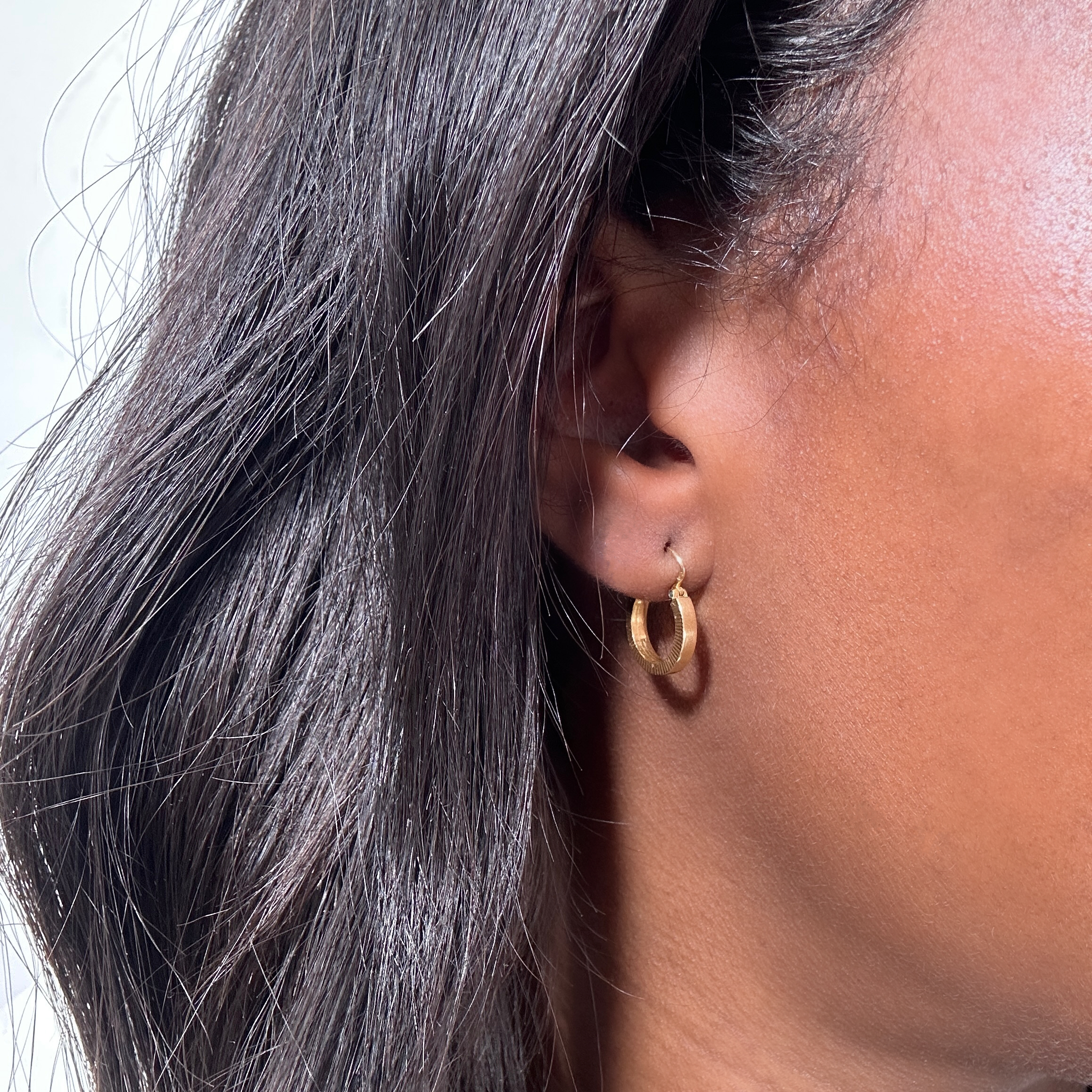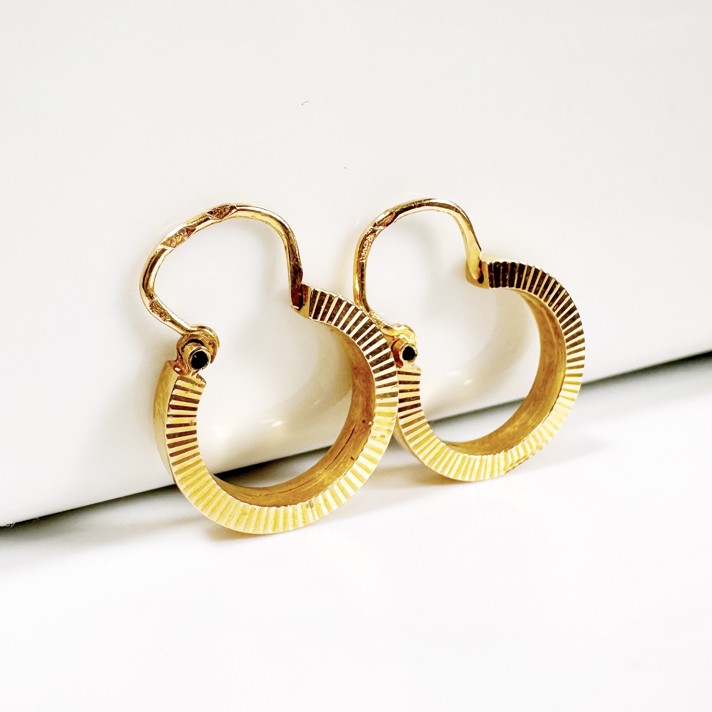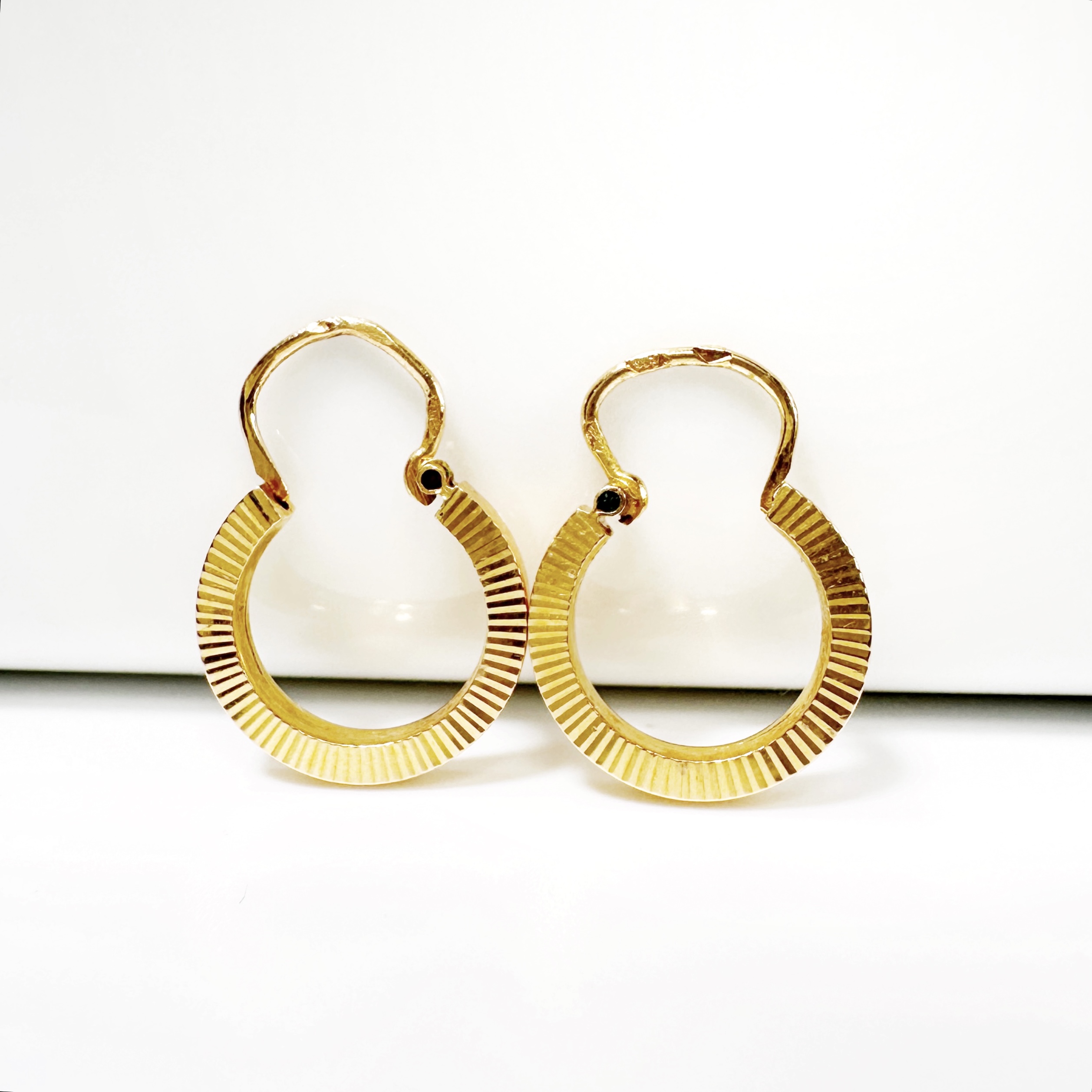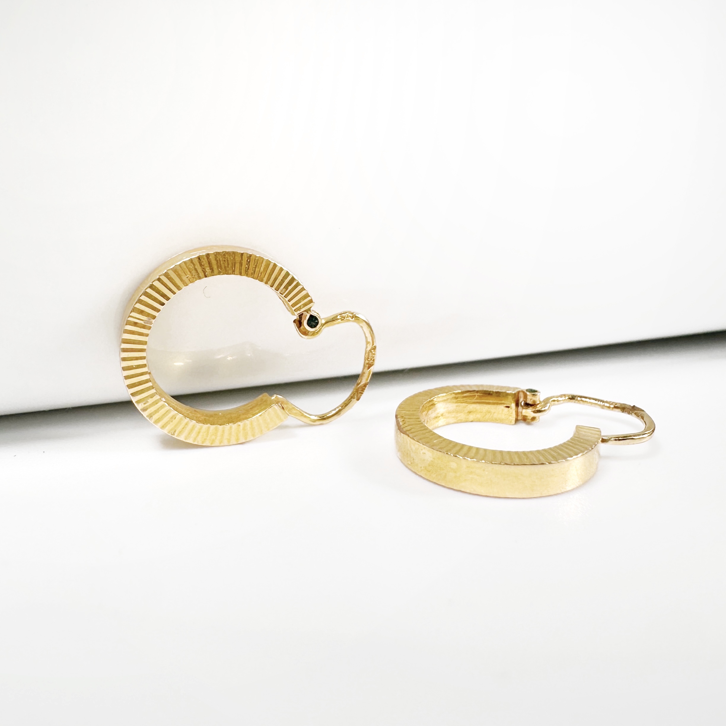 Magnifique paire de créoles en or 18 carats des années 50 dont le pourtour est décoré de rainures lui apportant un éclat scintillant et rayonnant. Une paire de boucles d’oreilles au style intemporel, à la fois élégant et facile à porter. Un classique sans lequel une collection de bijoux ne serait complète.