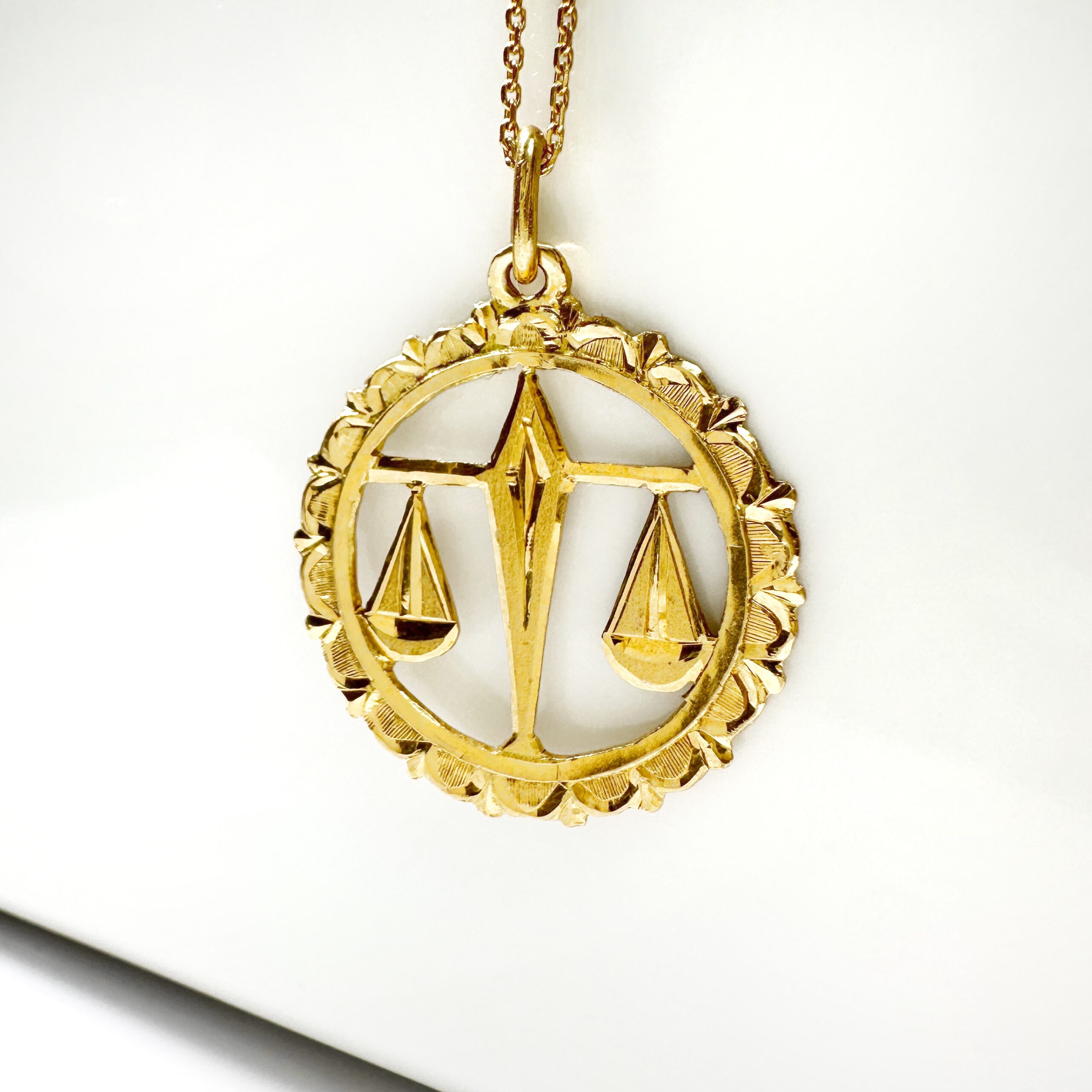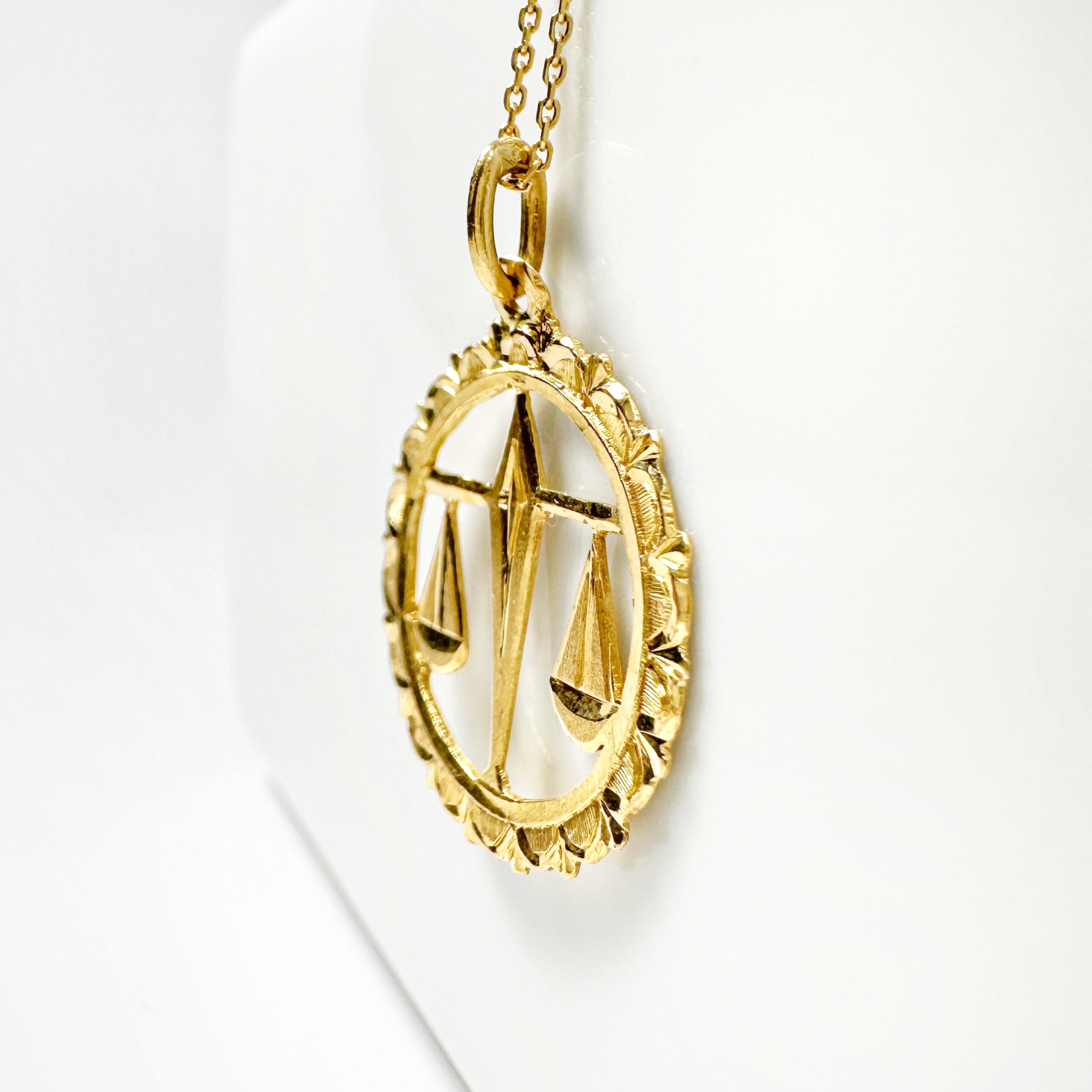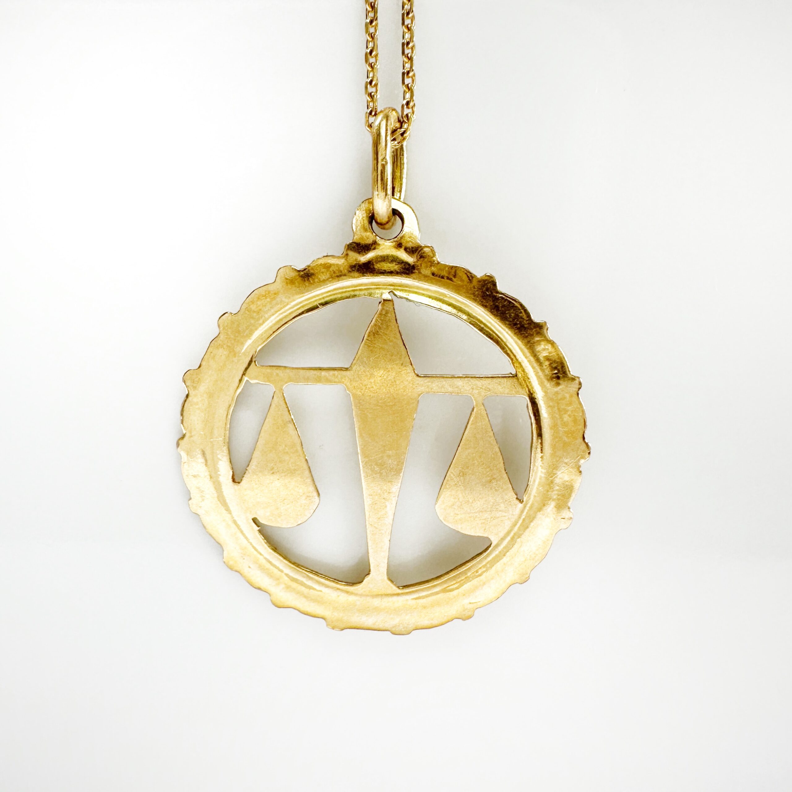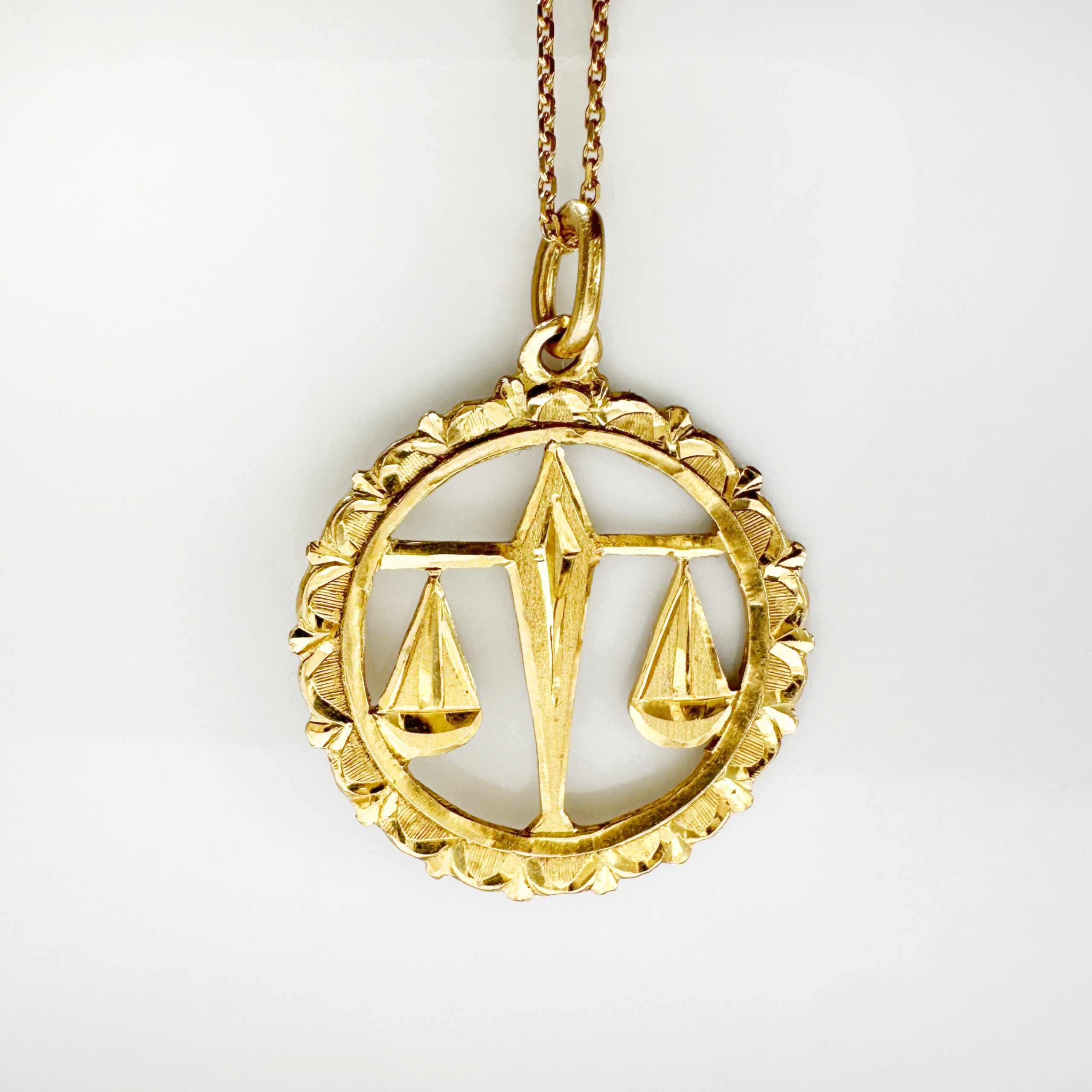 Sublime médaille ou pendentif des années 50 en or jaune 18 carats représentant le signe astrologique de la Balance. Retenue par une bélière mobile, cette médaille présente un motif en relief sur un fond mat entouré d’un cerclage en or ciselé pour une pièce toute en contraste.