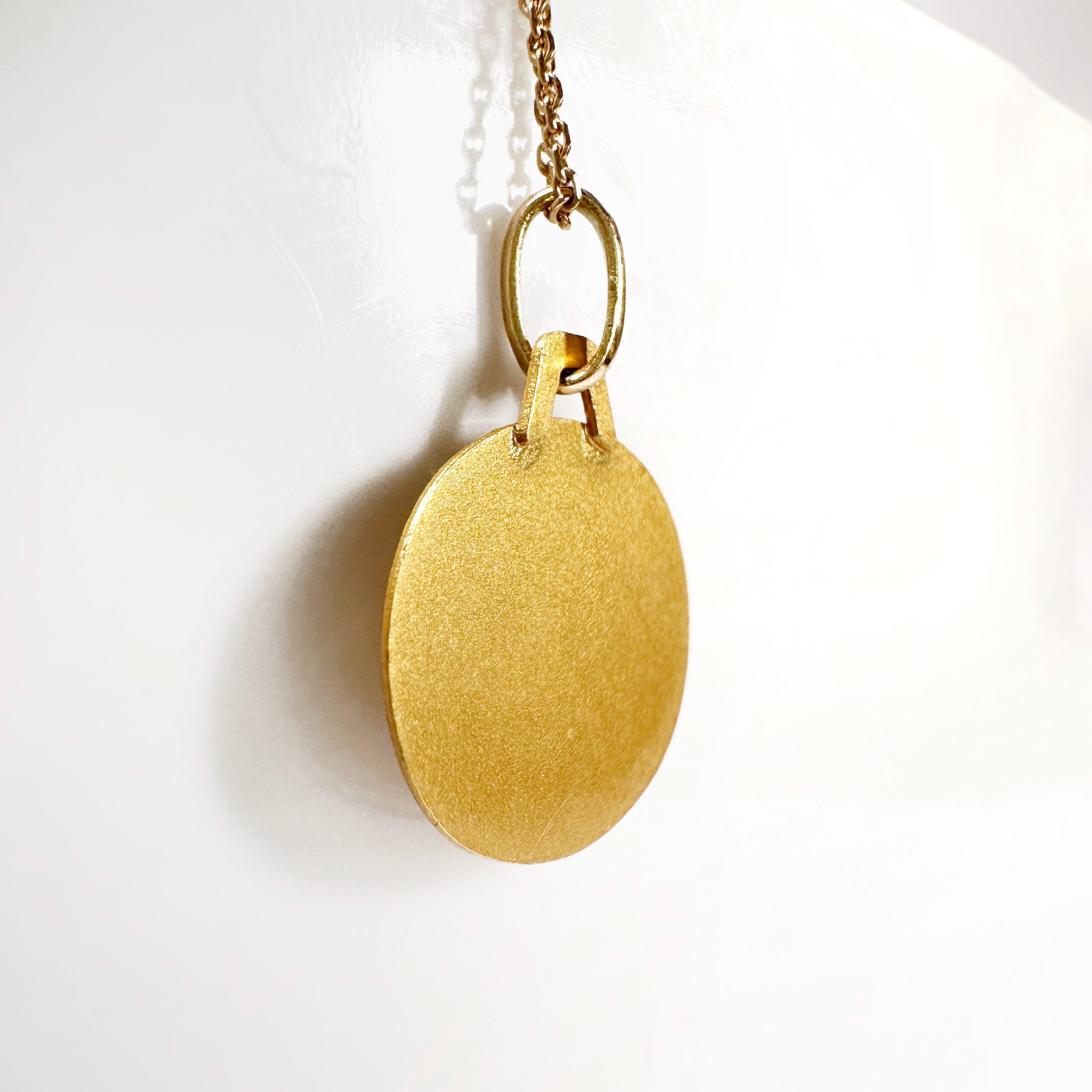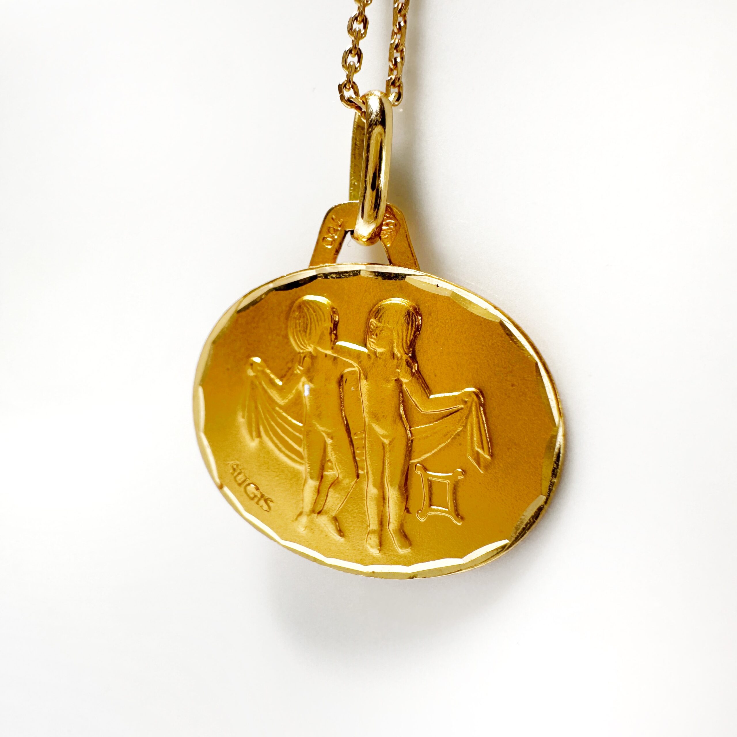 Sublime médaille ou pendentif des années 70 en or jaune 18 carats signé par la maison AUGIS, représentant le signe astrologique des gémeaux. De forme losangique et retenu par une bélière mobile, cette médaille présente un motif en relief sur un fond mat entouré d’un cerclage en or facetté pour une pièce toute en contraste.