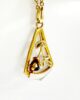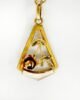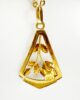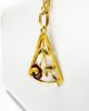 Sublime pendentif de l’époque Art Déco (1920-1930) représentant un triangle en or ciselé au centre duquel est nichée une rose délicatement travaillée, de sa tige fine à ses feuilles en passant par les pétales en corolle. Le bas du triangle est surmonté d’une pièce en or blanc de forme triangulaire à pans coupés et fini miroir pour un effet de réflexion de la lumière maximal. Une pièce typique des motifs de l’époque Art Déco, alliant modernisme et formes géométriques et les vestiges naturalistes de l’époque Art Nouveau la précédent.