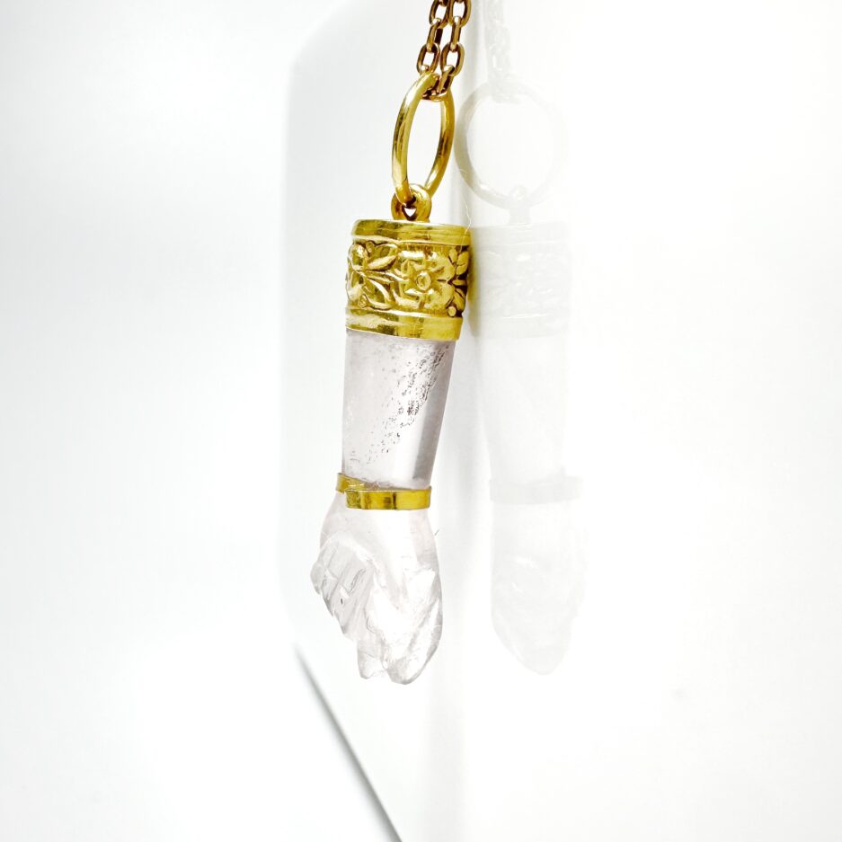 Imposant pendentif des années 70 en or 18 carats représentant le symbole porte-bonheur de la Mano Figa taillé en quartz transparent légèrement rosé. Retenu par une monture gravée de motifs floraux et une bélière mobile en or 18 carats, ce pendentif se portera comme un talisman autour du cou, seul ou en layering avec d’autres pendentifs.