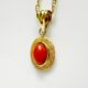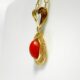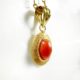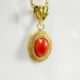 Sublime pendentif des années 60 en or jaune 18 carats sertie d’un cabochon de corail taille ovale d’1,3 carats d’une vibrante nuance orangée en serti clos surmonté d’une bélière mobile godronnée en pointe de flèche. Entouré d’un cerclage en or à fini diamant, ce pendentif élégant et coloré pourra aussi bien orner une chaine autour du cou seul ou accompagné d’un pendentif tout en or.