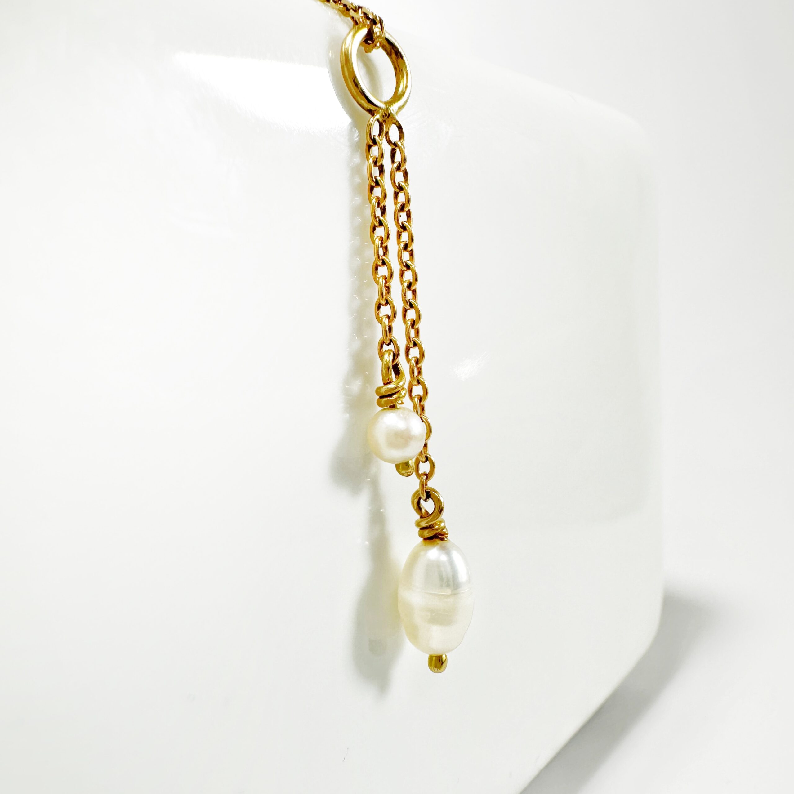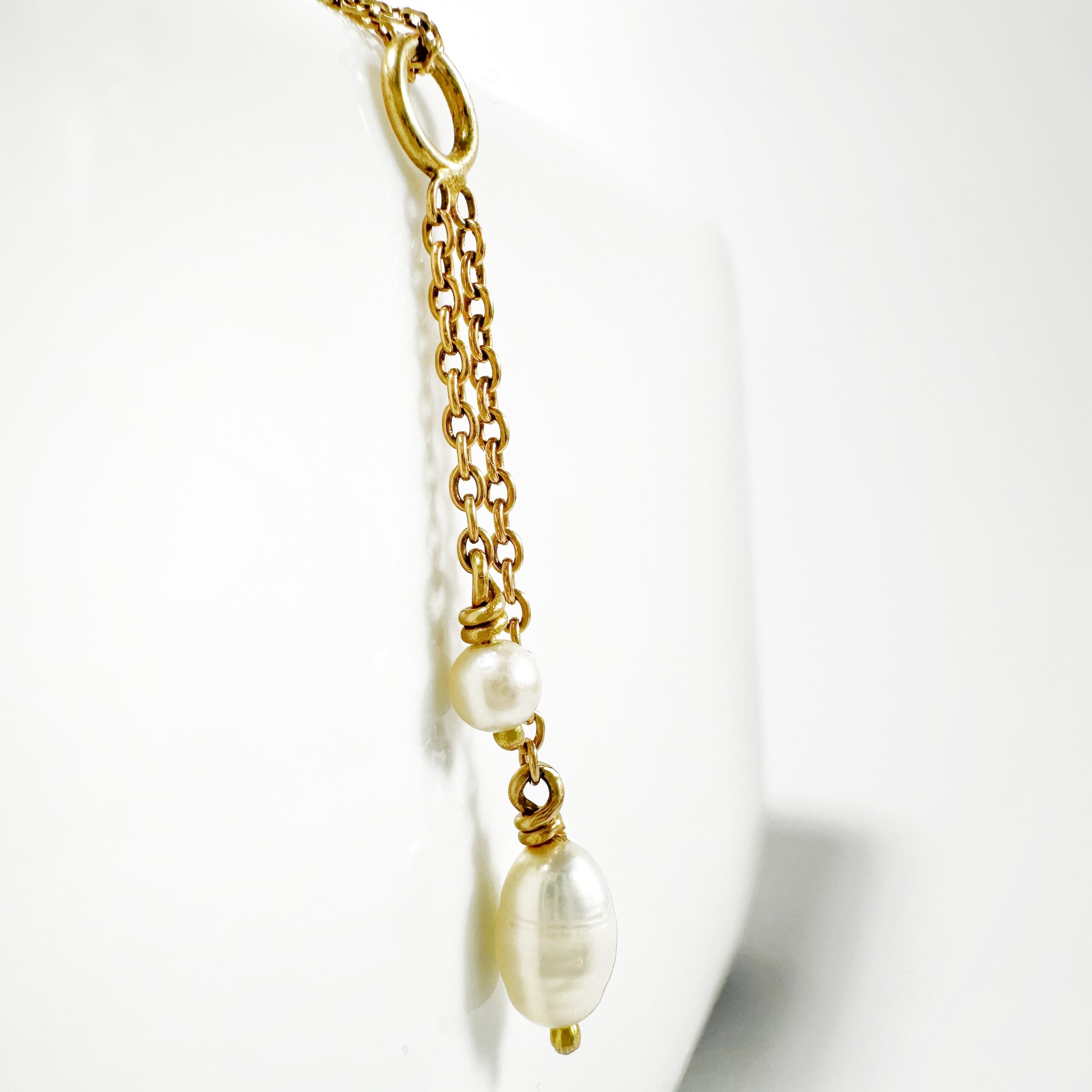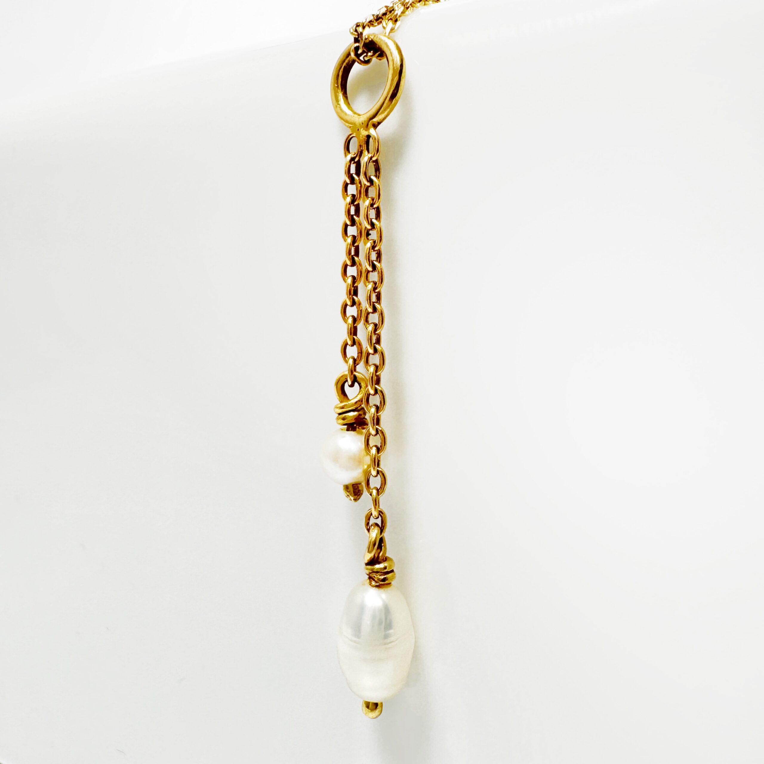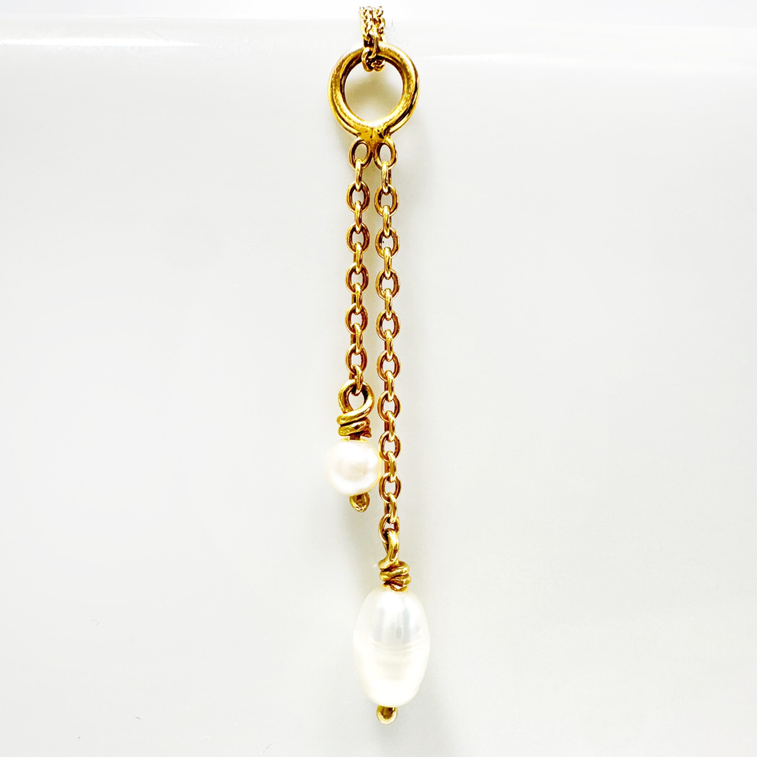 Adorable pendentif des années 70 en or 18 carats formé de deux chaines fines à maille jaseron de taille différente retenant respectivement une perle de culture ronde et une perle baroque de forme oblongue. Retenue par une bélière fixe, ce pendentif pourra se porter aussi bien sur une chaine fine au creux du cou que sur une chaine longue soulignant le décolleté. Un bijou féminin tout en contrastes subtils.
