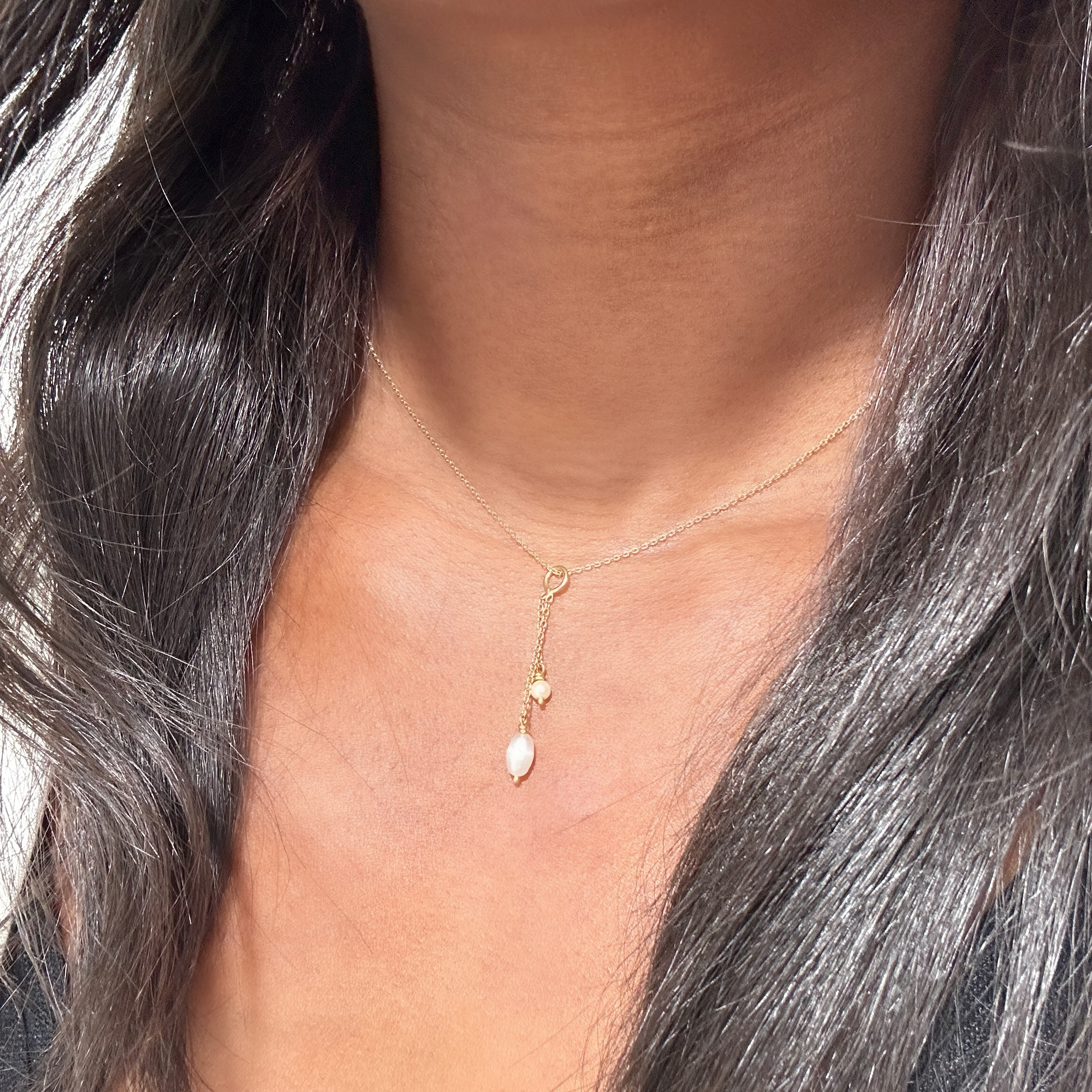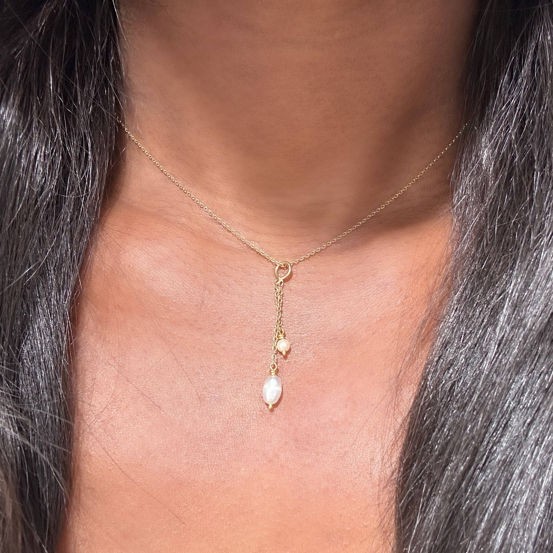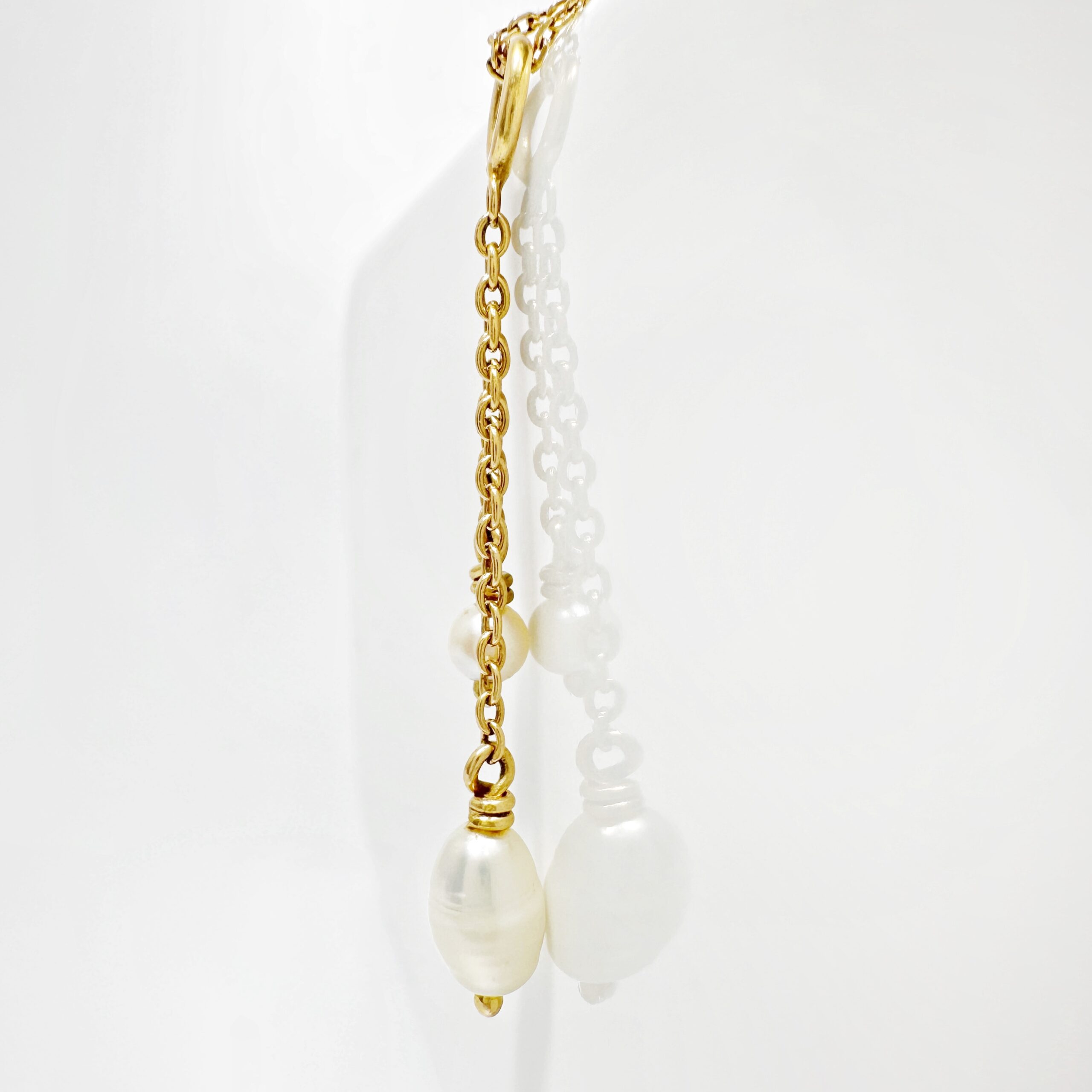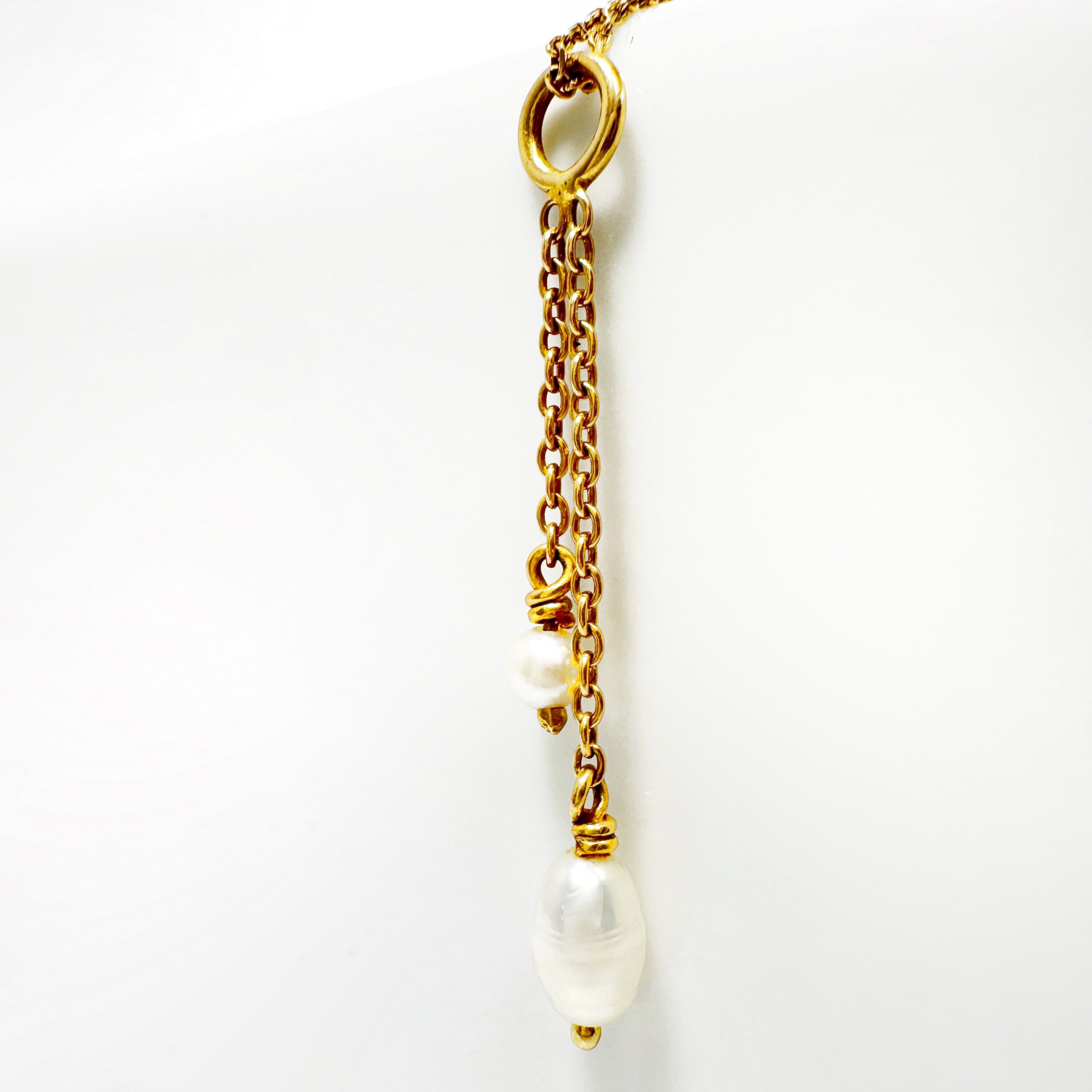 Adorable pendentif des années 70 en or 18 carats formé de deux chaines fines à maille jaseron de taille différente retenant respectivement une perle de culture ronde et une perle baroque de forme oblongue. Retenue par une bélière fixe, ce pendentif pourra se porter aussi bien sur une chaine fine au creux du cou que sur une chaine longue soulignant le décolleté. Un bijou féminin tout en contrastes subtils.