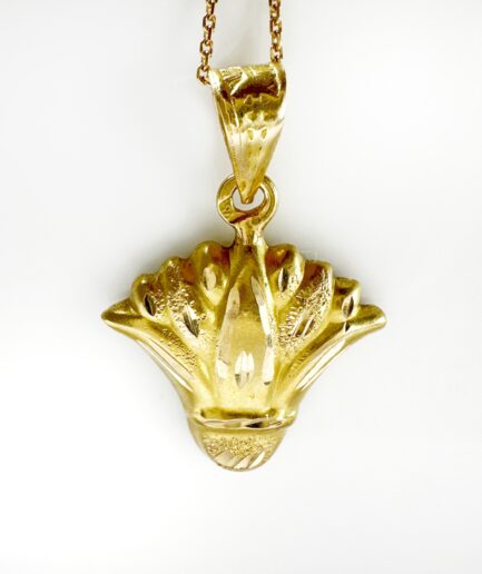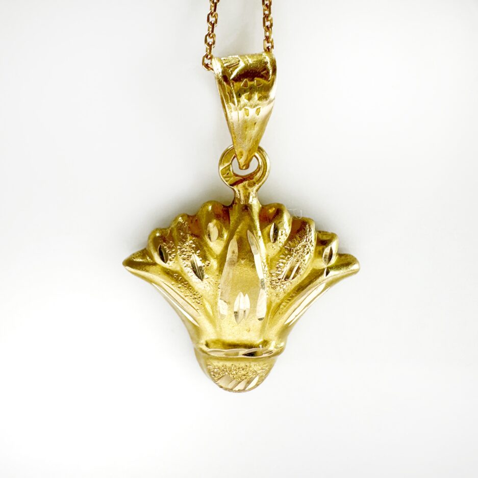 Sublime pendentif des années 60 en or 18 carats représentant une fleur de lotus toute en or, travaillé en contraste d’or mat et d’or brillant ciselé. Retenu par une bélière mobile à motifs égyptiens, cette pièce porte bonheur vous accompagnera autour du cou seule ou en layering avec d’autres pendentifs égyptiens.