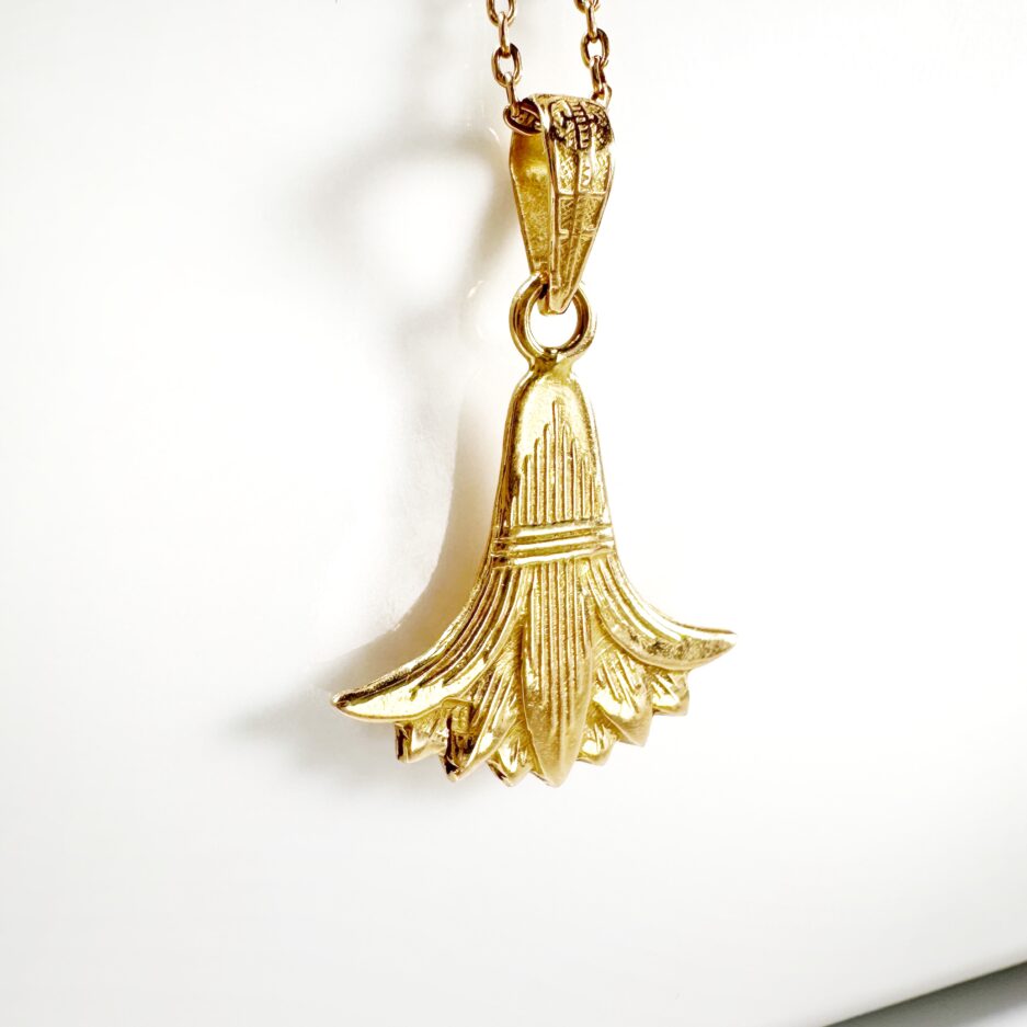 Sublime pendentif des années 60 en or 18 carats représentant une fleur de lotus toute en or, travaillé en contraste d’or mat et d’or brillant ciselé. Retenu par une bélière mobile à motifs égyptiens, cette pièce porte bonheur vous accompagnera autour du cou seule ou en layering avec d’autres pendentifs égyptiens.