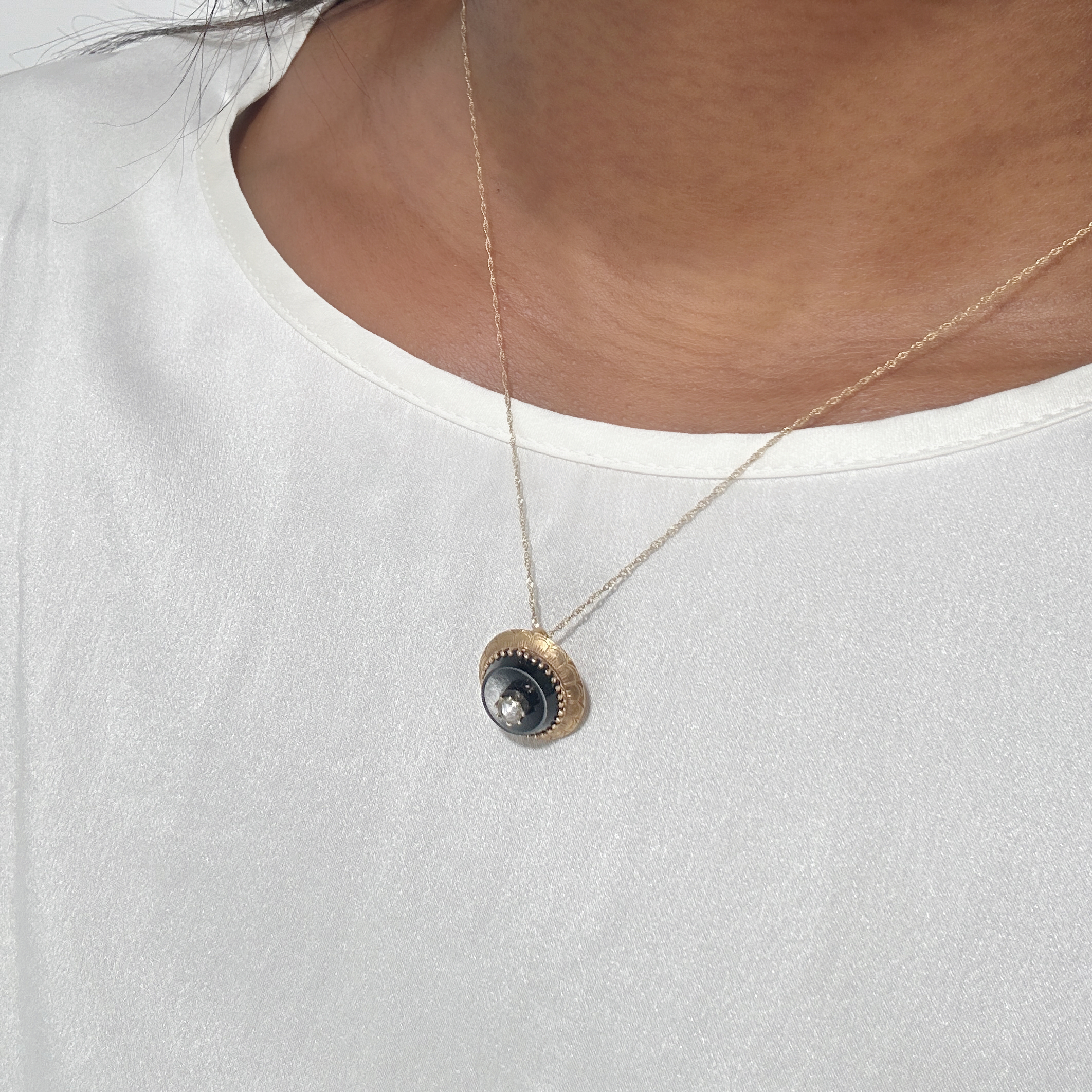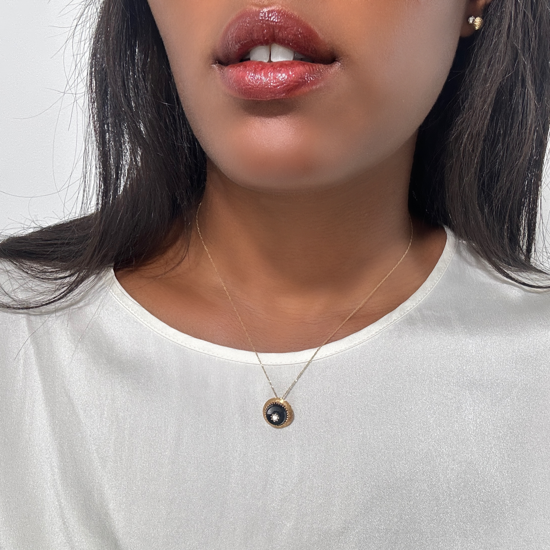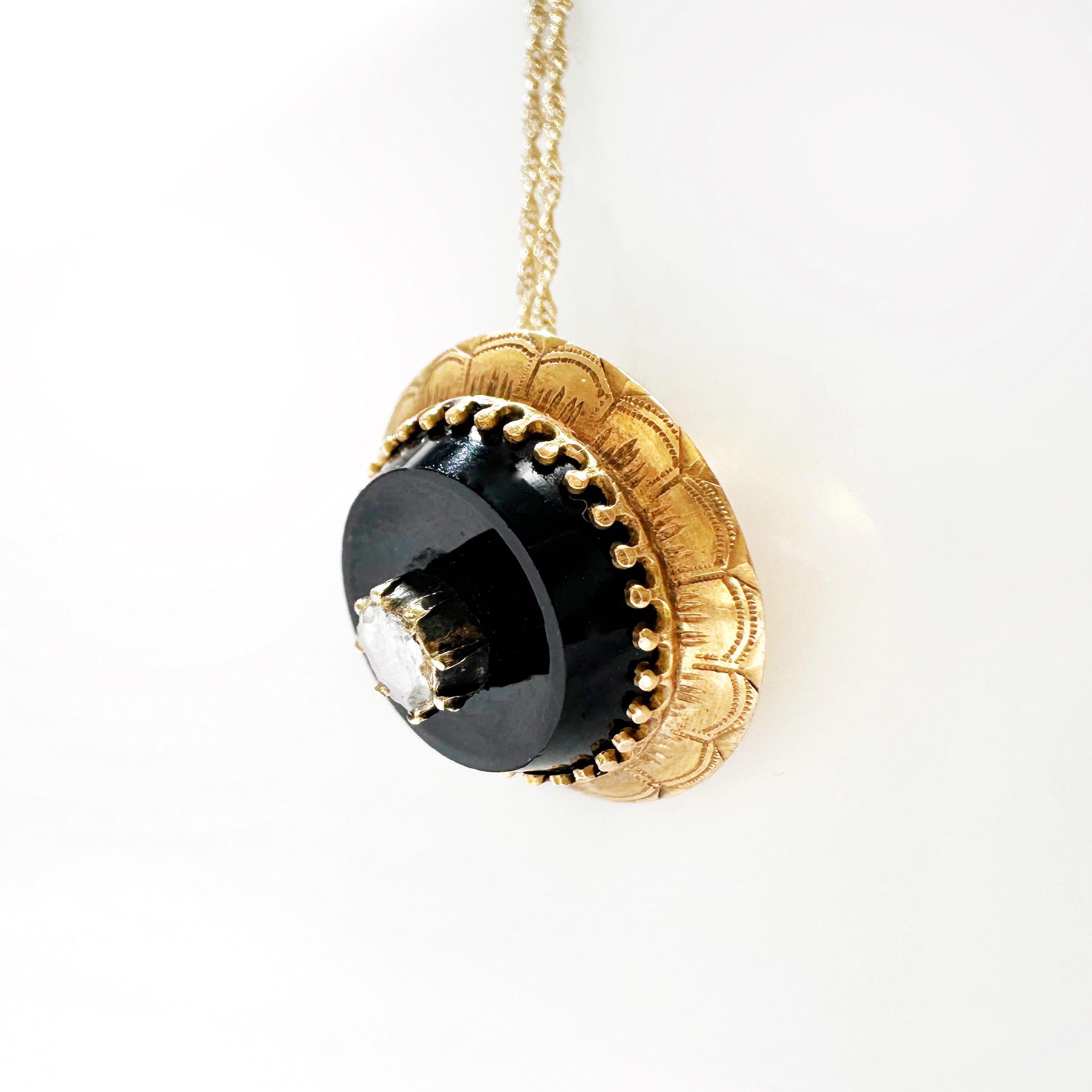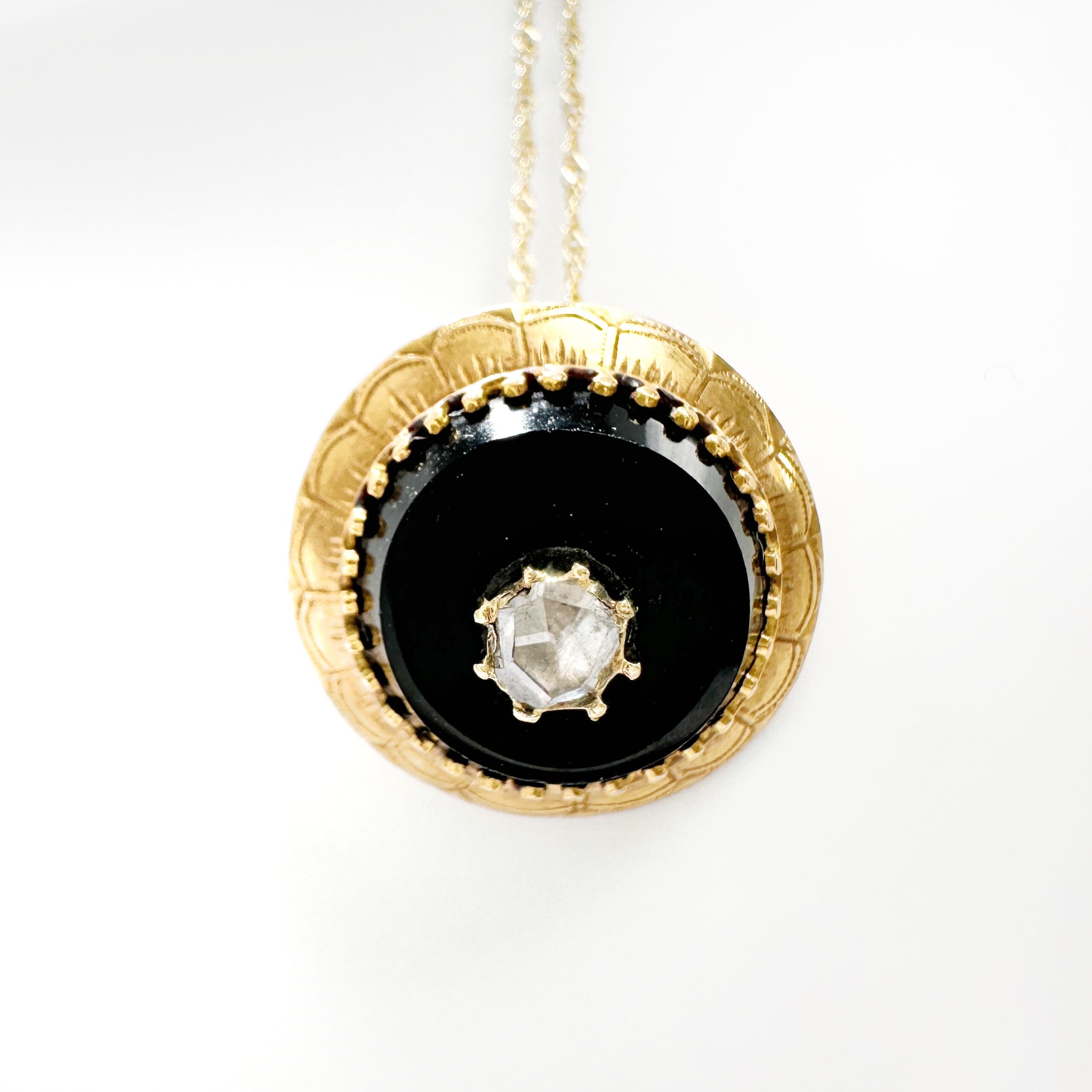 Cette nouvelle TransfÓ ou transformation signée ÓNÍSÌ PARIS est une ancienne épingle à cravate du XIXe siècle convertie en pendentif avec une bélière invisible. Le pendentif se compose d’un plaque d’onyx ronde sur laquelle est sertie un diamant taille rose de 0,1 carat en serti griffe. Une bordure en or ciselé apporte lumière et contraste à l’onyx, retenu en griffe également. Une pièce unique où le contraste de l’or jaune et de l’onyx noir est mis en exergue par la blancheur du diamant.