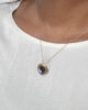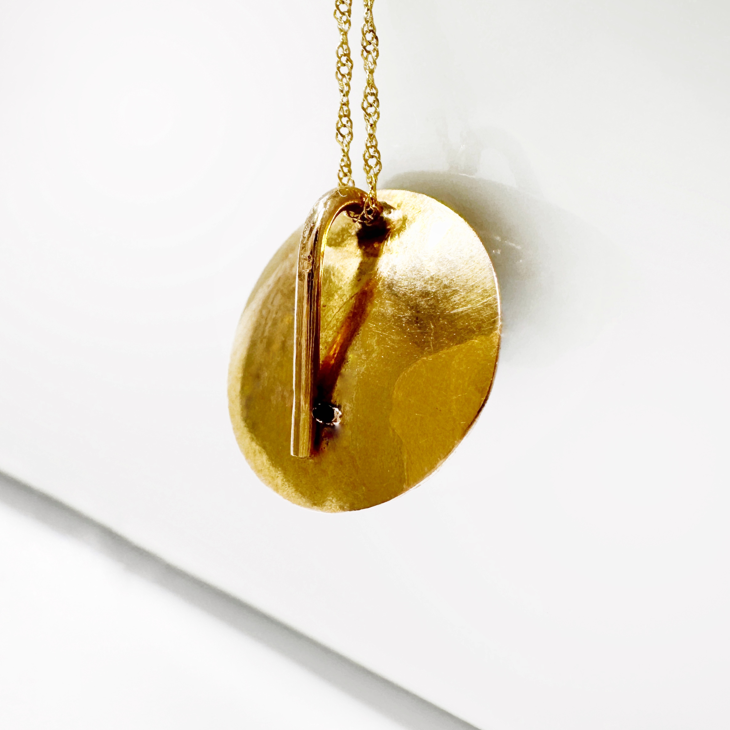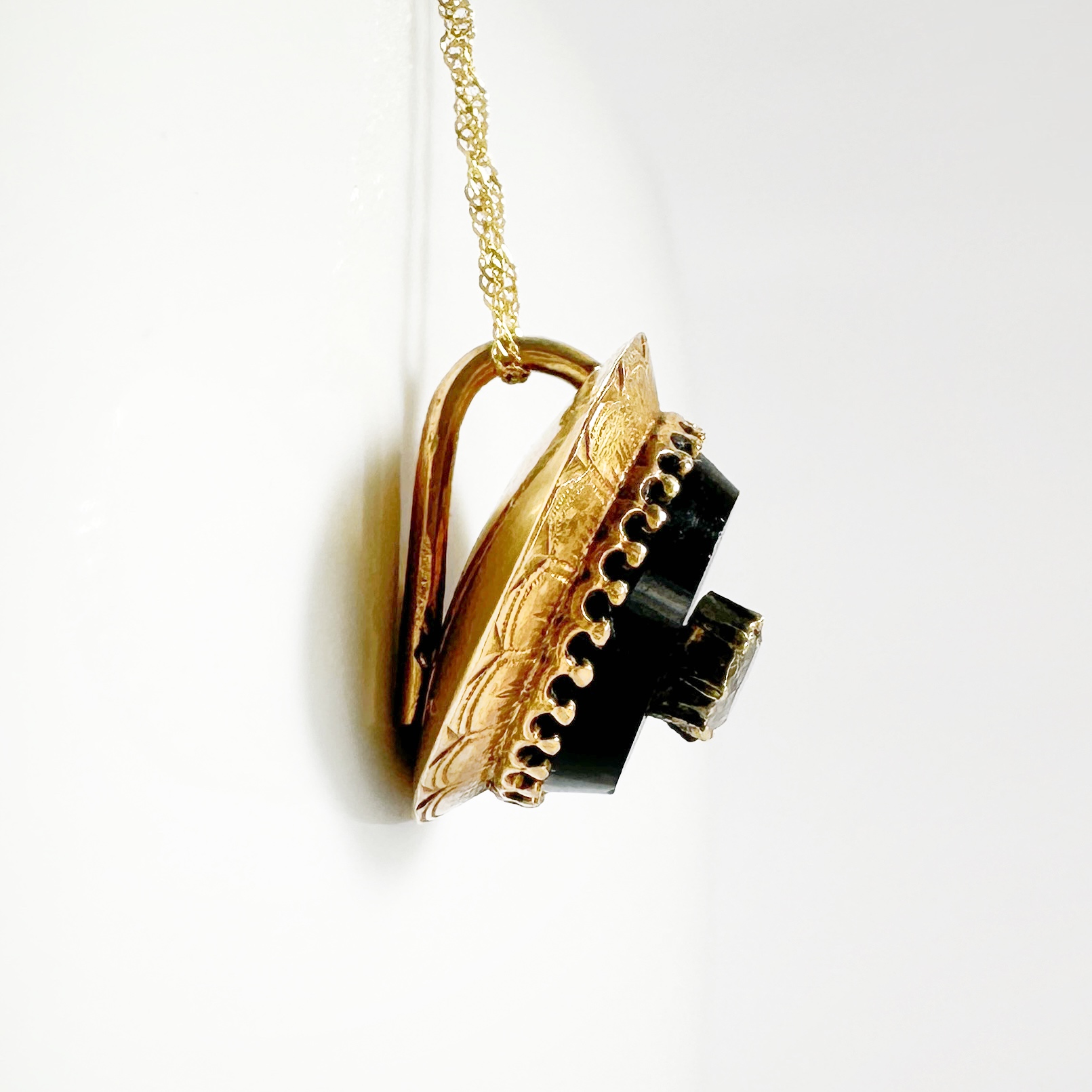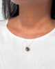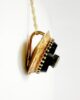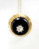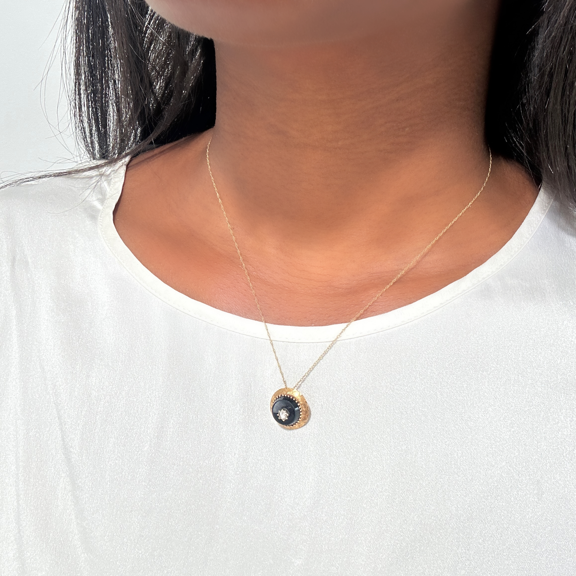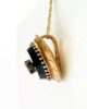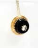 Cette nouvelle TransfÓ ou transformation signée ÓNÍSÌ PARIS est une ancienne épingle à cravate du XIXe siècle convertie en pendentif avec une bélière invisible. Le pendentif se compose d’un plaque d’onyx ronde sur laquelle est sertie un diamant taille rose de 0,1 carat en serti griffe. Une bordure en or ciselé apporte lumière et contraste à l’onyx, retenu en griffe également. Une pièce unique où le contraste de l’or jaune et de l’onyx noir est mis en exergue par la blancheur du diamant.