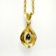 Sublime pendentif en or 18 carats des années 70 serti d’un sublime saphir taille poire de 0,3 carats d’un bleu indigo profond, et auréolé d’une subtile monture faite de volutes en or jaune à fini miroir et surligné d’une ligne en or blanc festonné à fini diamant serti d’un diamant taille 8×8. La bélière mobile incorporée au motif en arabesque du pendentif retient cette pièce raffinée avec discrétion.