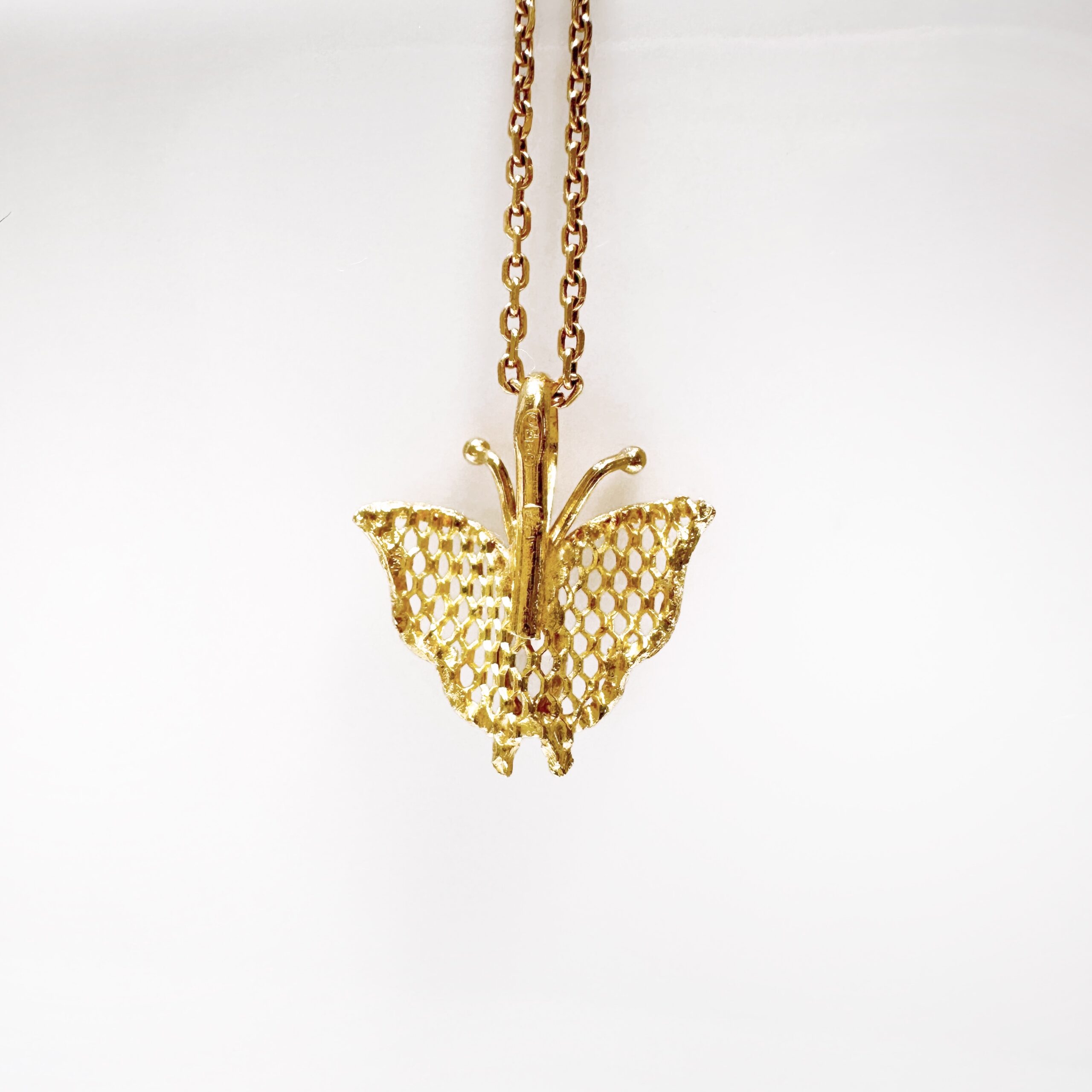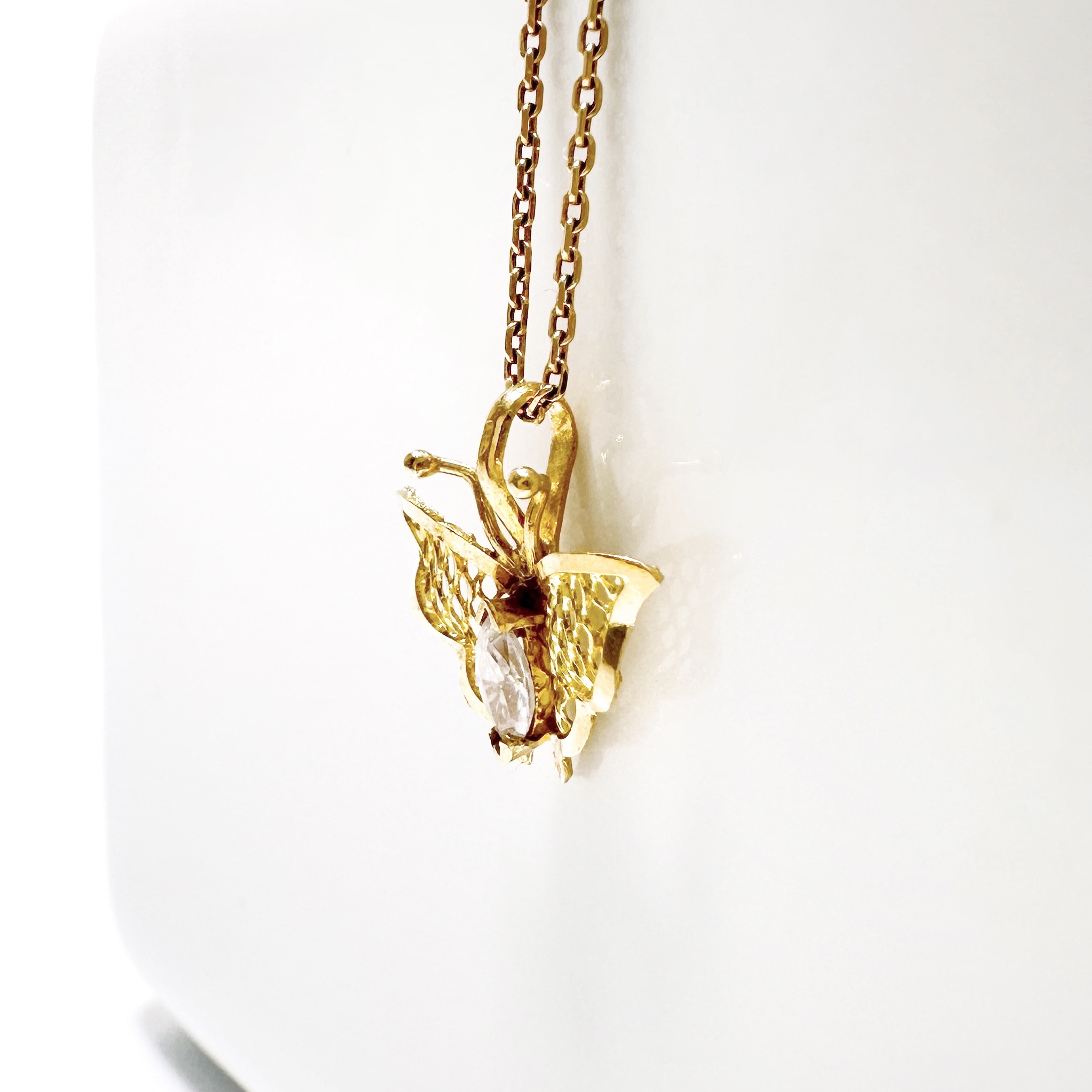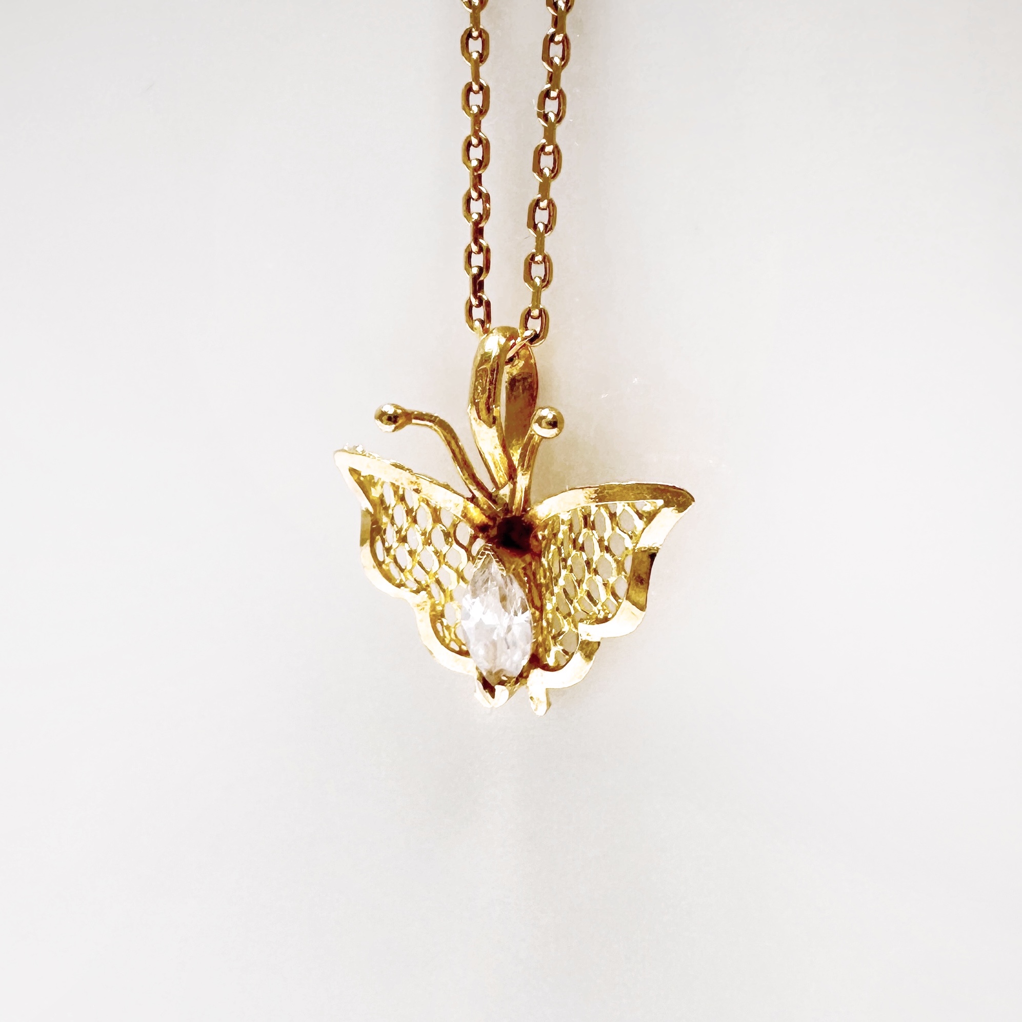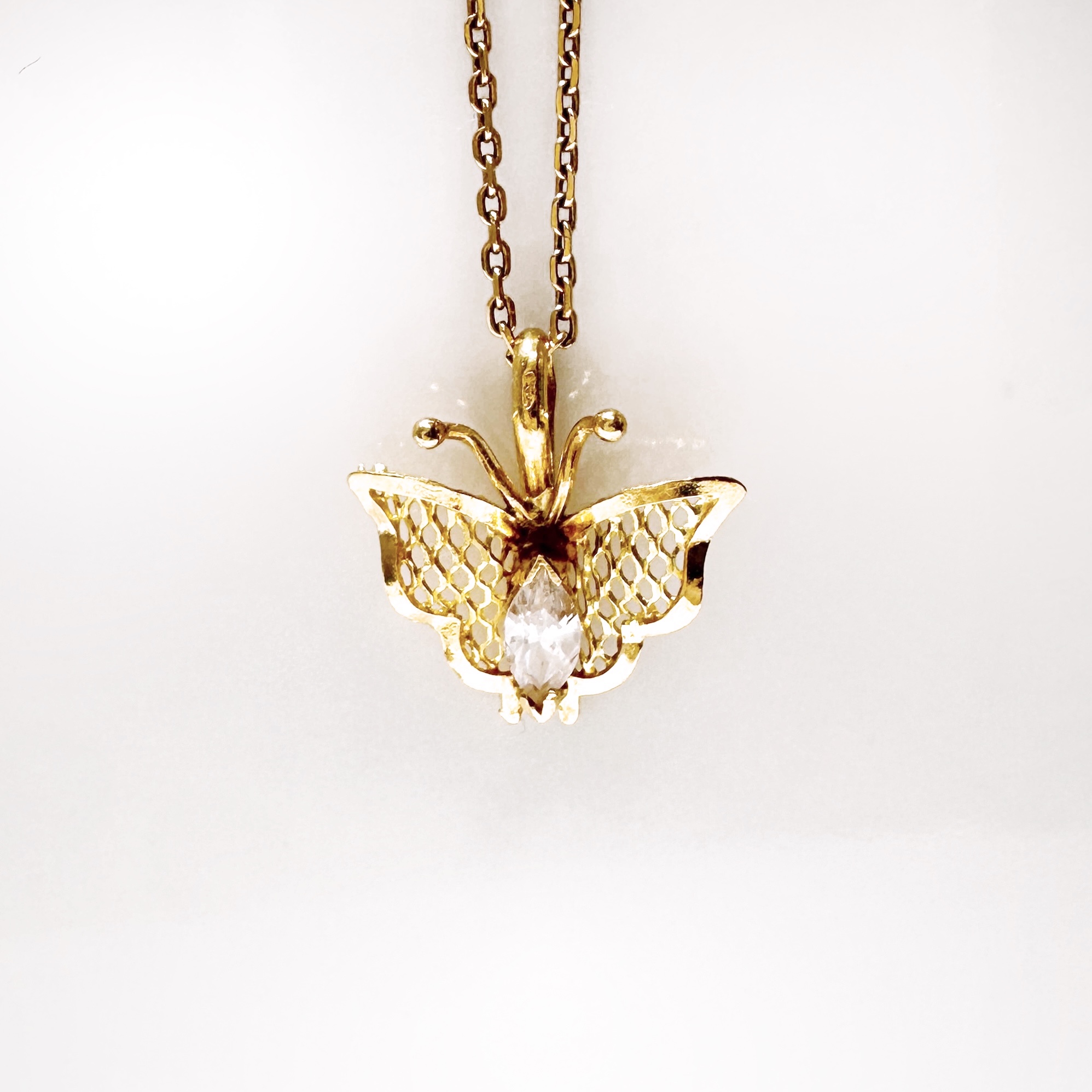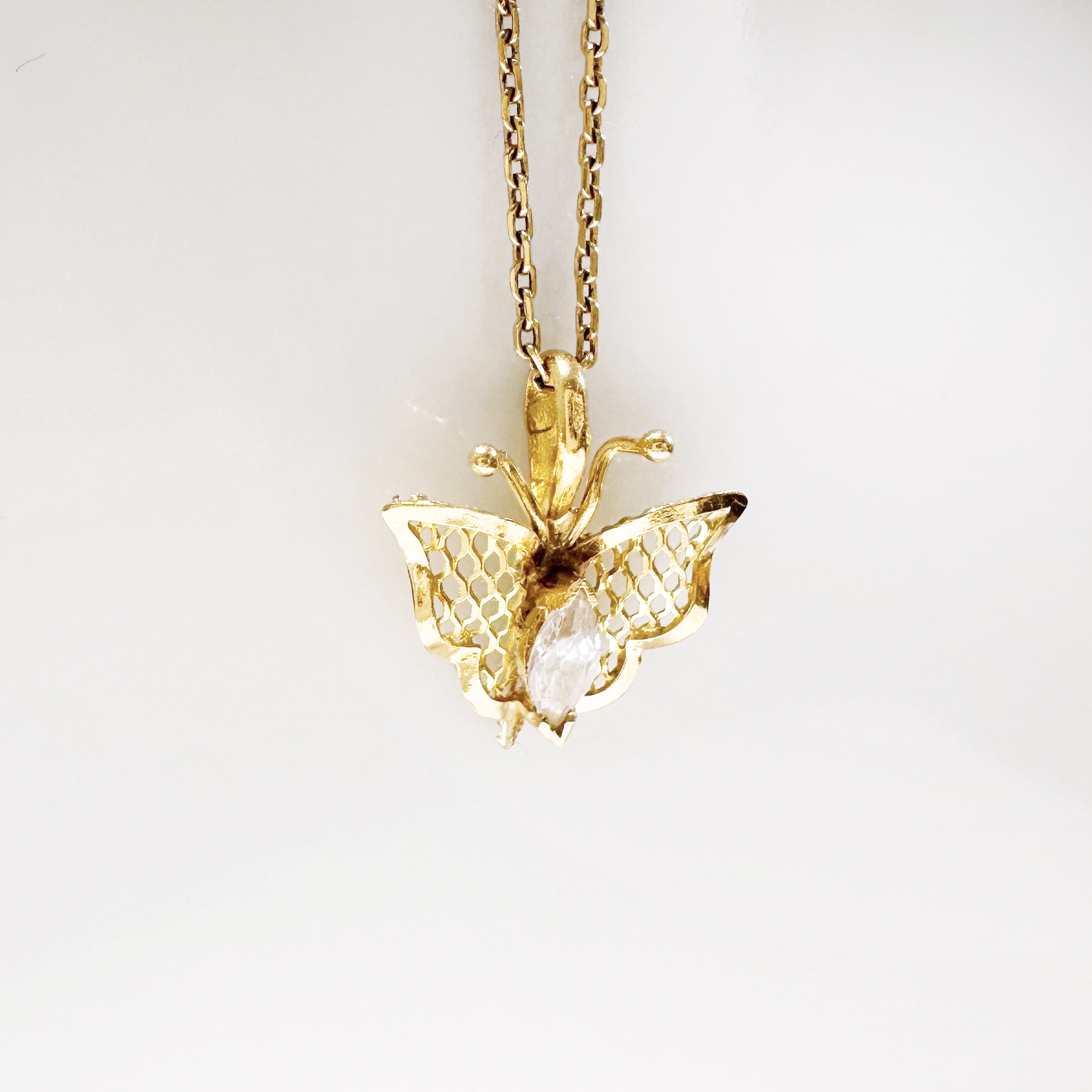 Délicat pendentif des années 60 en or 18 carats serti d’un saphir blanc taille marquise de 0,5 carat en serti clos au centre du motif. Ses aile, ciselées dans l’or comme un tissage ondulent subtilement et sont bordées d’or miroitant. Les deux antennes du papillon encadrent une bélière fixe pour porter cette pièce raffinée et bucolique sur une chaine fine.