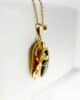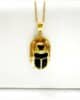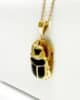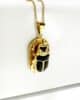Superbe pendentif des années 60 en or 18 carats représentant un scarabée finement ciselé, sa carapace couverte d’émail noir profond. Au dos de la pièce est gravée une plaque de hiéroglyphes en or brillant et mat. Une pièce en trois dimensions, toute en détails finement travaillés.