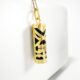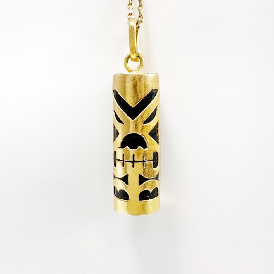 Sublime pendentif des années 70 en or 18 carats représentant un tiki. Formé d’un cylindre de jais, il est entouré d’un travail ouvert en or ciselé représentant le visage d’un gardien, une divinité Polynésienne. Un talisman porte-bonheur ancien à garder porter seul ou cumulé avec d’autres pendentifs,