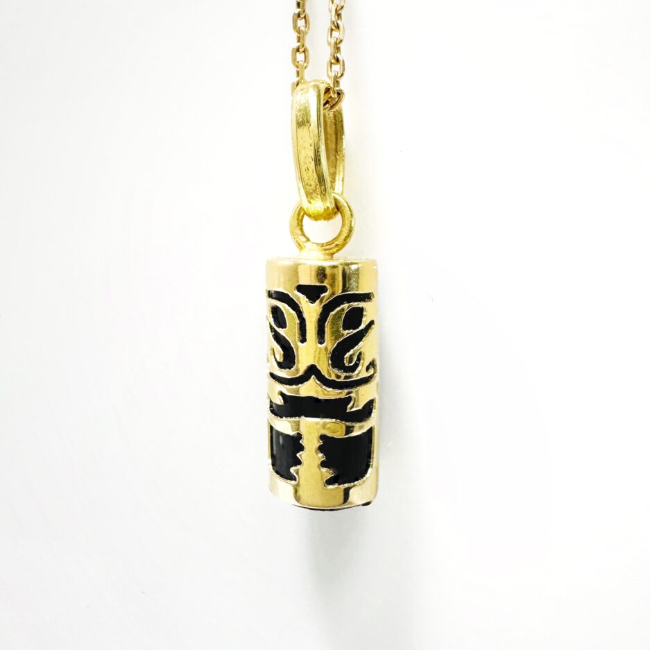 L’histoire: Les tikis polynésiens sont des sculptures traditionnelles que l’on trouve dans les îles de Polynésie, telles que Hawaii, Tahiti et la Nouvelle-Zélande. Ils revêtent une importance culturelle et spirituelle significative dans les sociétés polynésiennes, représentant des dieux, des ancêtres ou des gardiens. Souvent représenté sous forme de pendentif, ils symbolisent la protection, la fertilité ou encore la connexion aux ancêtres. Les pendentif Tiki se caractérisent par un cylindre en pierre couvert d’un motif en or ciselé représentant un gardien ou divinité. Il devient alors un talisman chargé de mystère et d’énergie, rappelant les liens intemporels entre l’homme et la nature, entre le passé et le présent. Ici, la pierre centrale est un onyx, une pierre connue en lithothérapie pour éloigner les mauvaises ondes et renforcer la confiance en soi. De plus, on dit de cette pierre qu’elle a le pouvoir de renforcer l’intuition, la purification et la guérison.